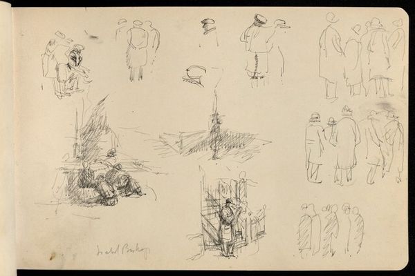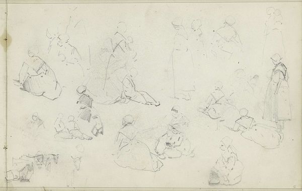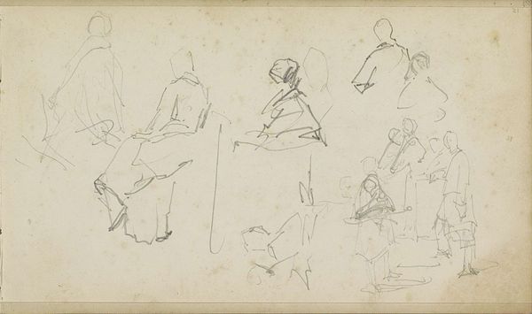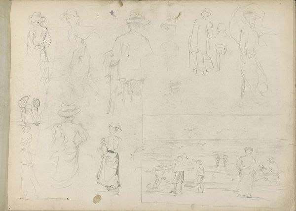 Curator: This evocative pen and pencil drawing is titled "Studieblad met ezelrijders en strandbezoekers," which translates to "Study Sheet with Donkey Riders and Beach Visitors." It’s attributed to Monogrammist DS, dating somewhere between 1850 and 1950. What do you think? Editor: Immediately, I see a commentary on leisure and social class. The loose sketches give it an informal feel, yet these are clearly people with the time and resources to visit the beach and ride donkeys. Curator: I see that too. Think about the era, probably late 19th century given the style. These beach scenes were becoming increasingly popular as leisure activities democratized, even if only for a specific social stratum. The figure sketching in what looks like a deck chair in the bottom-left, for instance, is engaging with leisure as spectacle and subject matter. Editor: It's interesting that we can infer so much from something that is essentially just a collection of quick sketches. There's a casualness, almost a fleeting quality, to these impressions of people, like captured moments rather than posed portraits. It's also possible that this is just practice; working through poses for a later project. I’m most intrigued by the figures arranged somewhat evenly around the whole composition. They’re rendered with varying levels of detail – some faces are distinct while others are simply suggested by form, headwear, or pose. Curator: And look at how the artist has used line weight. There is an implied dynamism, capturing a bustling beach even with sparse strokes. These scenes of genre-painting became powerful social signifiers and status symbols in Western society, reinforcing certain social norms and power structures. Editor: True, it really opens up into ideas around performance and societal expectations surrounding who has the right to be on the beach and to leisure. Even simple sketches like these have layers of cultural meaning embedded within them. Curator: It also prompts a conversation about the rise of tourism. Beaches became popular sites of display, but simultaneously, private spaces for self-cultivation, all wrapped up in class and identity. Editor: Thinking about this "Study Sheet", I think its loose execution emphasizes how fleeting the scenes were at the time and as a record, makes it precious and personal today. Curator: Precisely! These simple lines allow us to understand evolving norms of the social conditions in those times.
