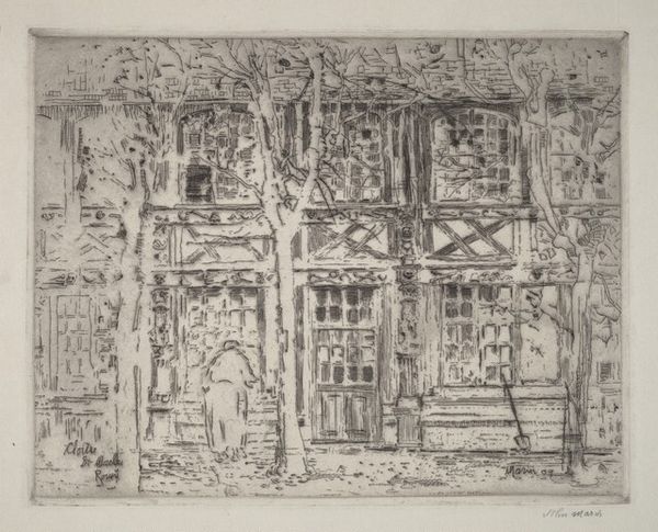 Curator: At first glance, I see a quiet melancholy, perhaps a commentary on the enduring, if fading, presence of institutions. Editor: This is "Old Dutch Church, Fishkill Village" by Childe Hassam. Hassam, who lived from 1859 to 1935, captured the scene with crayon and charcoal. The church seems to be partially obscured. Curator: Yes, the trees have an almost protective quality. Churches, especially old ones, are potent symbols of community, tradition, and sometimes, exclusion. The foliage softens the architecture, though. Editor: The image of trees enveloping a church resonates with cycles of life and nature. The church remains a steadfast figure, even if veiled, implying the continuity of faith. Curator: The red brick detailing feels assertive against the softness of the trees, suggesting enduring power. Considering Fishkill's own complex history, this image sparks questions. Editor: Agreed, the interplay is fascinating. Hassam perhaps wanted to express the relationship of time and place. It encourages introspection about the legacy of institutions within a community. Curator: It certainly does. Thank you for sharing your perspective. Editor: And thank you, that’s been a great discussion.