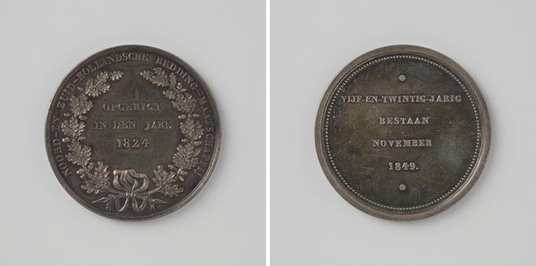 Editor: This unassuming silver medal, minted in 1849, commemorates the 25th anniversary of the North and South Holland Lifeboat Society. There's something rather stoic about it, don't you think? Quite unlike what I imagined a celebration piece to be. How do you interpret it? Curator: Stoic is an interesting choice, and I agree, in a way. But I also see determination, and quiet strength in that almost severe simplicity. It lacks overt joyousness. Think of the historical context—1849 was a year of immense upheaval, revolutions had swept across Europe. Perhaps this piece, created anonymously, emphasizes duty and civic responsibility above exuberant festivity. The oak leaf wreath also speaks to qualities like steadfastness, honor, longevity. What do you think of the lettering? Editor: The lettering…it feels quite formal, wouldn't you say? Stiff even, a bit like a schoolmaster’s pronouncements? I wonder if the piece was ever meant to be worn. It seems much too heavy to lug around. Curator: Exactly! Function definitely follows form here. I see it more as a token of appreciation, a memento given to individuals, a quiet marker in time. Medals such as these held immense cultural currency back then. Were you thinking along the lines of neck ornamentation, maybe? Editor: Initially, yes, but its substantial size and density steer me away from that view. Perhaps it was given as an award? The heft definitely gives it more of a "display" gravitas. Curator: I agree. To me, this object speaks volumes about the values and ideals of the mid-19th century: Duty, resilience, community... values perhaps somewhat understated today! Editor: It makes you wonder about the stories of those early lifeboat crews, doesn't it? People braving the elements...It offers such a poignant snapshot into that past. Curator: Absolutely! I now have this vision of salty-faced rescuers in heroic poses… quite dashing really. I find that its quiet exterior unlocks such grand, untold sagas.