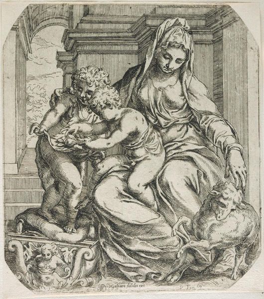 Curator: This is Sebald Beham's "Cimon and His Daughter," a work currently residing in the Harvard Art Museums. Editor: The scene feels incredibly intimate, despite the rough texture of the engraving and the architectural setting. There's a compelling tenderness in their poses. Curator: Indeed. Beham masterfully employs the stark contrasts of the engraving to highlight the figures, drawing attention to the emotional weight of the daughter's sacrifice. Editor: It is a powerful representation of filial devotion. The daughter becomes an embodiment of charity, echoing classical themes of sacrifice and redemption. Curator: Note the precise rendering of the architectural elements. They establish a structured, almost oppressive space, underscoring Cimon’s imprisonment and his daughter's agency. Editor: The imagery is striking—the breast being both life-giver and symbol of defiance against death. Beham evokes a potent emotional dialogue about survival, power, and love. Curator: I appreciate how your understanding helps bring out this image's intrinsic form and content, revealing how inseparable form and meaning can be. Editor: It's astonishing to witness such a simple composition hold such depth and a reminder of how art reflects enduring human conditions.