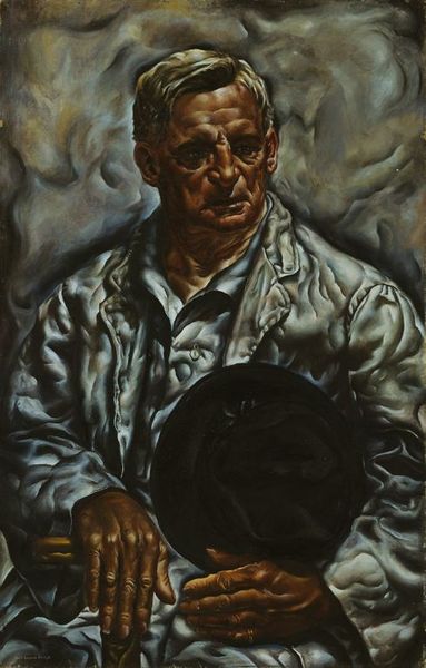 Curator: Take a moment to view this striking oil-on-canvas painting. Made in 2018 by Zani Corrado, it’s titled "Portrait of Lee Marvin." What's your immediate reaction to it? Editor: Immediately, I'm drawn to the almost theatrical lighting and the sense of gravitas it gives. The way light catches the metallic sheen on his cap, juxtaposed against the shadowy depths of his expression, it hints at the weight of a life lived, marked perhaps by both triumph and hardship. Curator: Indeed, it speaks volumes about the cultural fascination with this Hollywood persona. Marvin projected a very specific brand of masculinity and "tough guy" appeal that resonated with audiences. And that association with iconic film roles certainly inflected how he was received. What do you make of the artist's choice to portray him this way? Editor: Well, the cigar becomes an emblem here – a symbol deeply associated with power, leisure, and perhaps even defiance. Consider how it frames the face, drawing the viewer’s attention to that enigmatic gaze. It amplifies his screen persona; he seems to challenge the observer, projecting world-weariness. Curator: Absolutely. There's a visual echo of countless movie stills, solidifying his role as an archetypal figure. We should also note the way Corrado employs realism in a relatively contemporary context. What do you think are the possible influences? Editor: In this painting, the visual language seems steeped in a classic Hollywood sensibility, recalling not only promotional photography but perhaps the works of artists like John Singer Sargent, particularly regarding his portraiture's frankness. Curator: And also given Sargent's use of oil paint, what do you make of Corrado's treatment of the paint itself? The somewhat loose brushwork lends the work a feeling of immediacy and a connection to the "everyman", contrary to his famous standing in media and film, yet in line with the down to earth vibe Marvin was known to have projected outside his roles. Editor: I would argue it humanizes a cultural icon. This portrait serves not just as a representation, but a poignant reminder that even the most recognizable figures leave an indelible mark. Curator: And with that impact also an enduring reflection on cultural memory and representation.