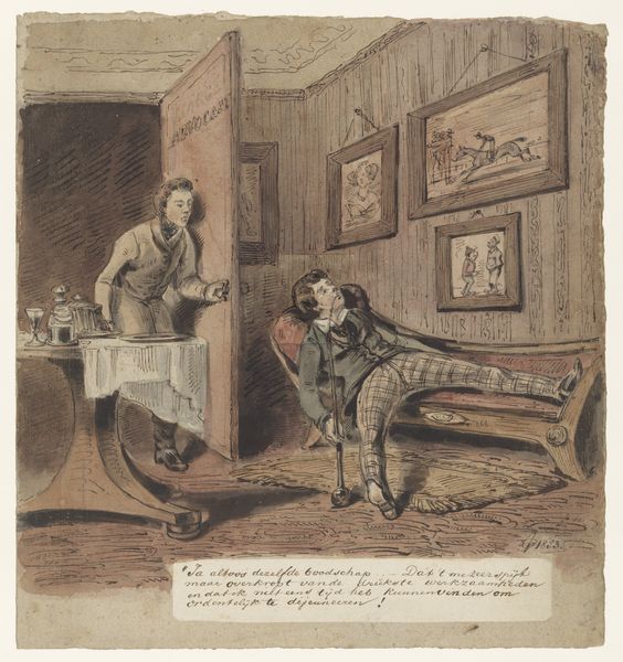 Paul Gavarni created this print, "Two Students Under the Influence of Love," sometime in the mid-19th century. The print, now held at the Rijksmuseum, offers a glimpse into the romanticized yet often fraught lives of Parisian students. Gavarni, working during a time of significant social change and romantic fervor, captures the emotional intensity associated with love and youth. The students' disheveled appearances and melancholic poses suggest a deep immersion in their feelings, perhaps to the point of distraction. Their identities as students are central, reflecting a specific demographic experiencing both freedom and the pressures of intellectual and emotional discovery. This piece taps into the complex interplay between personal emotion and social identity, inviting viewers to reflect on the universal experiences of love, longing, and the search for meaning. It resonates as a reminder of the emotional turbulence that often accompanies the journey of self-discovery.