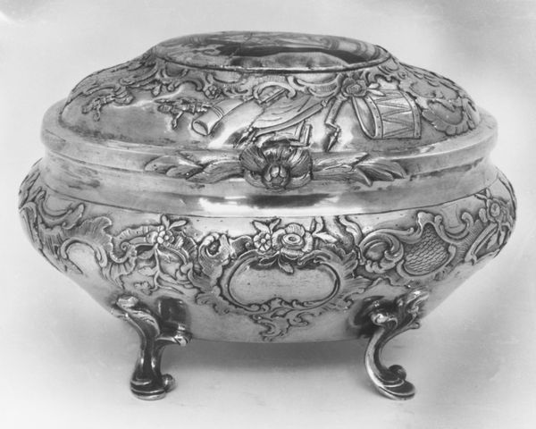 This silver beaker was crafted by Conrad Kerstner sometime in the 17th century. Immediately noticeable is the contrast between the smooth, polished surfaces and the intricate floral decorations, creating a sense of depth and movement. The beaker's form is relatively simple: a cylindrical body resting on spherical feet. Yet, Kerstner's artistry lies in the details. The floral motifs are not merely superficial adornments; their sinuous lines and organic shapes evoke a sense of vitality. This can be interpreted through the lens of semiotics, where the floral designs serve as signs representing nature's abundance and beauty. The interplay between the smooth metal and the textured reliefs challenges fixed meanings. Ultimately, Kerstner’s combination of form and decoration transcends mere functionality, inviting ongoing interpretation of its aesthetic and cultural significance.