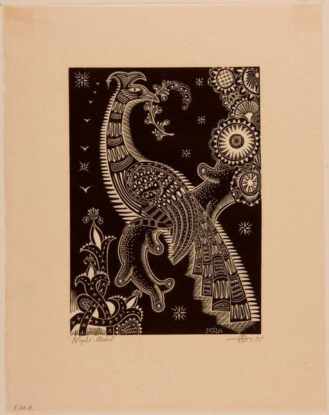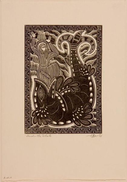 Editor: This is "Jonah" by Alfonso Ossorio, a wildly detailed print. The swirling lines and stark contrast create a really intense, almost claustrophobic feeling, don't you think? What do you make of it? Curator: It's a visual feast, isn't it? Ossorio dives deep into the story, not just depicting it but embodying the psychological turmoil. The whale isn't just a beast, it's a landscape of the subconscious. Do you see how Jonah seems to surrender, almost dance, with the whale? Editor: I do, now that you mention it. It's less about struggle and more like... acceptance? Curator: Precisely! Perhaps it's about confronting our own inner "whale," those overwhelming challenges we try to escape. It’s about finding a strange sort of peace within them. Editor: That's a powerful way to see it. It definitely makes me think about facing my own fears. Curator: Art reflecting life, and life reflecting art. Beautiful, isn't it?