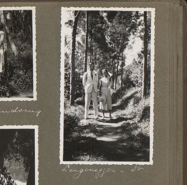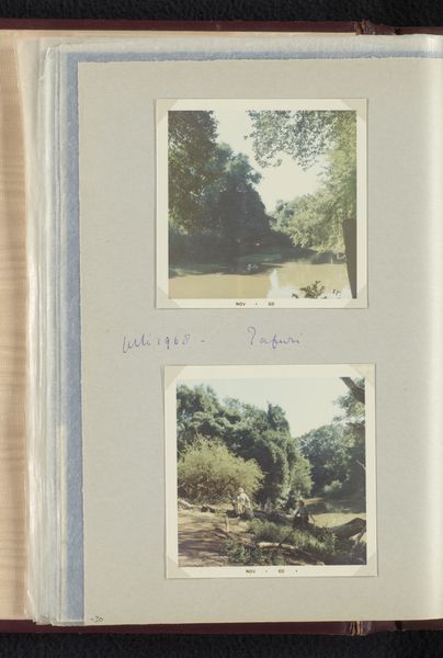 Curator: Welcome. The piece before you is a collage titled "Willem van den Berg met een vrouw en een jongen bij een rivier in Makuleke, Zuid-Afrika," created in 1968. It combines photography and, potentially, colored pencil or watercolors, and comes from van den Berg's personal sketchbook during his time in Makuleke, now part of the Kruger National Park. Editor: Oh, wow. I immediately feel a kind of bittersweet nostalgia looking at it. Like someone captured a stolen moment in time. The sepia tones lend it this timeless, slightly faded quality. There is almost like someone reminiscing, looking back on a cherished memory of connection with family, and nature. Curator: Exactly. The composition reflects broader societal issues, of how individuals were situated within, or sometimes estranged from, the landscape, especially during a time marked by social and political complexities in South Africa. It invites us to consider the relationship between identity, belonging, and the environment. Editor: I can imagine a gentle, peaceful vibe, a welcome contrast to any potential political climate, if it existed in real time. A kind of sanctuary. Perhaps that's what makes it poignant. Do you know how personal is sketchbook was used and displayed? Curator: The fact that this piece is within a sketchbook context provides a very private viewing space. As you said, that intimacy with family life is at its core, it’s a snapshot, seemingly idyllic, yet the complexities of the time are undeniable when looking at the placement. A reminder that personal lives and art exist intertwined within broader societal systems, policies, and historical trajectories. Editor: Right, it speaks to the power of those moments amidst social upheaval or whatever may be going on. Beautiful how that can coexist. It's the visual equivalent of holding onto a beautiful song during a storm, you know? Curator: I completely agree, understanding van den Berg’s creation of a scrapbook and the collage and painting medium is valuable for understanding its commentary. This work contributes a layer to understanding intersectionality, reminding us to consider the interplay between the aesthetic, personal, and the politically informed environment of its creation. Editor: Yeah, it adds layers to everything, which I didn't even think was possible when first seeing it. Now when I see these kinds of works, and I am curious to remember the story beyond the painting. Thanks for unveiling it for me, for us.