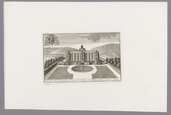 Curator: Looking at this image, the most immediate thing that strikes me is its formality, its precision. The rigidity of the lines, the symmetry of the gardens, it's almost...austere. Editor: Precisely! This is "Gezicht op de Sint-Jacobsabdij in Luik", or "View of Saint James' Abbey in Liège". It’s rendered between 1738 and 1744 by an anonymous artist. This pen-and-ink sketch offers us a glimpse into not only the architectural grandeur of the abbey but also the societal role such institutions held. Curator: You can certainly see that in the meticulous detailing. Each window seems identical, each garden square perfectly aligned. It presents a very controlled, ordered image of the Abbey, which speaks to the importance of this institution, reflecting its power and permanence. Did that symbol at the upper left represent that? Editor: The symbol is the iconographic marker, if you will, of the Abbey’s power. The shield, likely heraldic, and ornamental flourish tells of history, and pedigree. The symbols offer both continuity of institution and a message about the place to those who knew it. It represents the ideals the institution wants to project and those that they wanted to perpetuate in that community. It would communicate status. Curator: And, of course, this wasn’t simply an objective rendering. Its perspective is interesting too. elevated almost, giving the sense that this is a well ordered space of both mind and soul. How did the artist go about creating the actual view? Editor: What strikes me is how the Abbey, centered and imposing, is given as much emphasis as the architecture. Its verticality leads the eye upward, a direct visual cue towards spiritual ascension. And around the structure is a highly patterned, geometrical garden. This is about an earth order mirrored by the heaven order of spirituality that buildings offered. Curator: Indeed. A demonstration of earthly and heavenly harmony as dictated by the Abbey, reinforcing its centrality within society. The way it is viewed really shapes our understanding. Editor: The rendering captures not just a building, but the underlying philosophical framework that gave it significance, and continues the use of symbolism through the language of its architectural space. Curator: A fascinating intersection of artistry and institutional messaging. It truly makes you think about the social impact through time and symbol. Editor: Agreed! It invites us to think about our connection with these buildings that were so key to past populations.