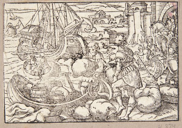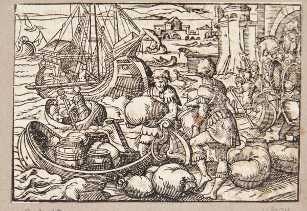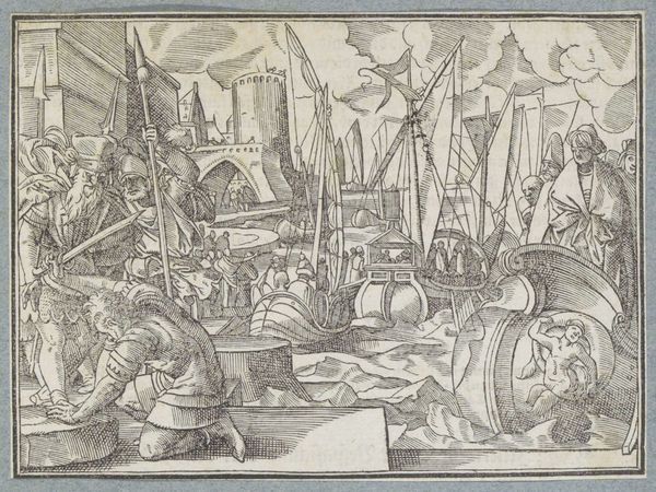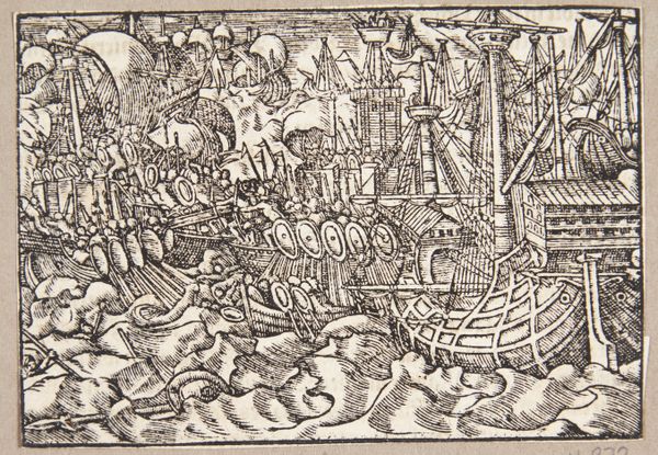 Tobias Stimmer created this woodcut depicting Gaius Duillius's naval victory over the Carthaginians. Notice how the composition is filled with intricate details and activity. Shapes of ships, shields, and waves create a dynamic, almost chaotic scene. The use of line is particularly striking, defining every form with precision. Stimmer’s technique creates a complex interplay between positive and negative space. Each line contributes to the overall texture, rendering depth and movement. The density of lines varies across the image, creating contrast and emphasizing certain elements, such as the towering ships. Considering the historical context, this work aligns with the Renaissance interest in classical subjects and the celebration of military achievements. This piece goes beyond mere historical documentation and presents a highly structured representation of conflict. Stimmer transforms the battle into a visually engaging narrative through formal organization.