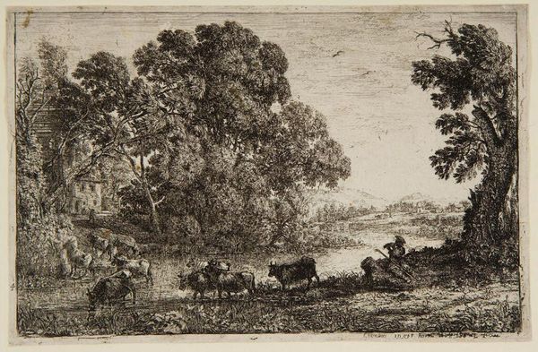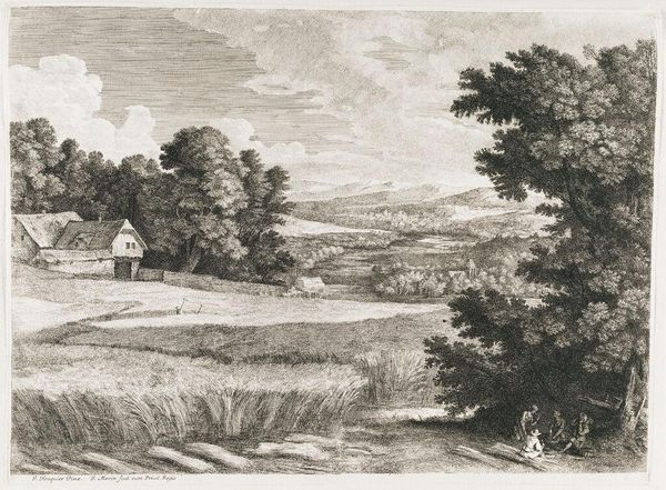 Curator: This is "Landscape" by Jean Jacques de Boissieu, a delicate etching that invites quiet contemplation. Editor: It evokes a sense of pastoral calm, doesn't it? The delicate lines and tones create a harmonious composition. Curator: Indeed. The etching technique, with its intricate network of lines, emphasizes the scene's idyllic mood. Consider the political context; it reflects the elite’s romanticized view of rural life. Editor: But look closer: the composition leads the eye from the detailed foreground to the abstracted mountains, creating a visual hierarchy. The placement of the figures adds dynamism. Curator: True, and this emphasis on hierarchy does suggest a specific social order being reinforced through art. Editor: It’s a fascinating interplay between form and social commentary, a delicate landscape with profound implications. Curator: A scene of beauty that masks societal power dynamics.