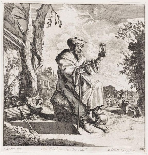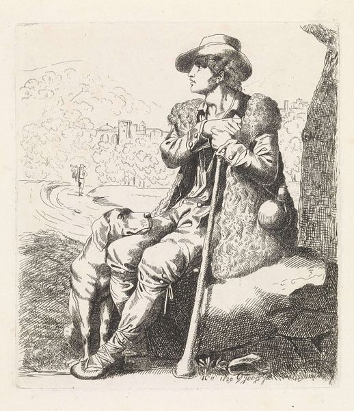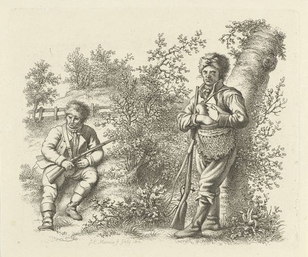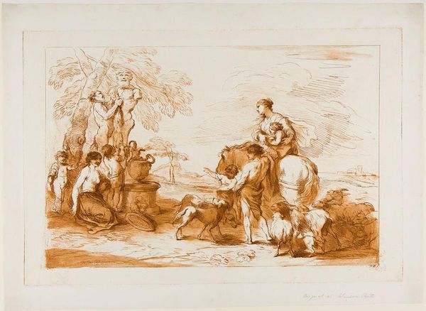 Curator: This is Enrico Nardi's "Peasants Pausing on a Country Lane," created in 1881, employing watercolor as its primary medium. It's currently held in a private collection. What strikes you initially about it? Editor: It has a muted, nostalgic feel. Almost sepia toned. I’m getting a strong sense of weary labor, observing their stance and somber attitude on what is a simple rural environment. Curator: Genre paintings such as this one gained popularity during the late 19th century, reflecting an interest in depicting everyday life. The costumes they wear are striking: Could you tell me more about it? Editor: Yes, and while ostensibly representing everyday life, it idealizes the simplicity of the peasant life. These traditional costumes speak volumes – highlighting the region’s cultural identity while perhaps romanticizing rural work conditions. We see a young man, a lady with traditional head covering and colorful decorated clothes and another yound man apparently working or kneeling to find something. Curator: Precisely. The attention to detail in their clothing indicates Nardi’s awareness of representing a specific group. We must not overlook the perspective. In this instance, Nardi gives visibility to a sector generally unmentioned and neglected by mainstreams. It also reminds to Manzoni and “I Promessi Sposi”, where this costume is well explained. Editor: What’s compelling is not merely what’s displayed, but what’s absent. Is there any reference for what the people portrayed were living during the era? Because “peasant life” can also be synonym of social marginalization in a rapidly industrializing world. Are we appreciating it merely for its aesthetics, or does it prompt reflection on the socio-economic disparities of that period? Curator: Indeed, engaging with the work on this level moves beyond merely observing into questioning power structures inherent within the Italian culture of the 19th century. What's shown and what is not shown shapes public perceptions. Editor: Yes! By revealing these absences and tensions, this artwork ceases to be only a relic of the past. We transform the piece into a starting point for modern discourses on gender, class, identity, and labor. Curator: A thoughtful perspective, bringing it into contemporary discourse in ways Nardi likely never envisioned, isn't it? Editor: Absolutely. And by thinking critically we can discover a renewed relationship with it, giving rise to transformative and engaging artistic exchanges.