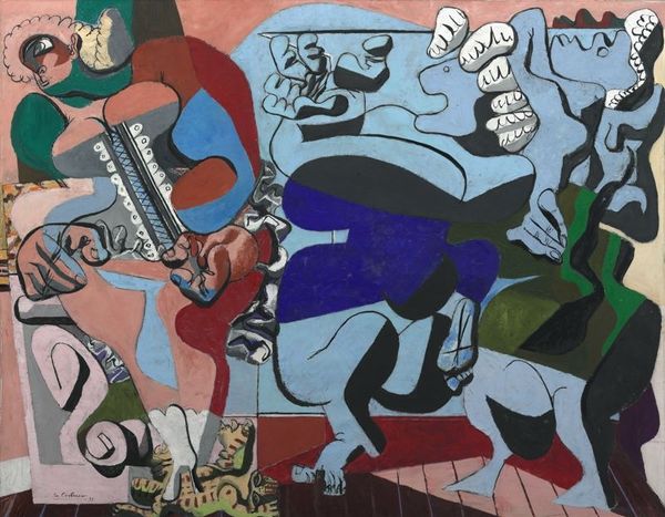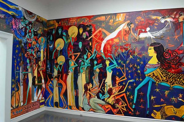 Curator: Wow, it's like a chariot race through time. Editor: It is a rush, isn't it? What we have here is Alaa Awad's "Justice" created in 2016. It is primarily executed in acrylic paint. What grabs you first about this piece? Curator: The frenetic energy, definitely. So many figures, wheels turning, animals leaping. It’s a mad dash, but for what? I wonder if Justice here is running away from something. Or towards something? Editor: Well, when you look closer, you notice that it blends recognizable figures from ancient Egyptian iconography with a street art aesthetic, a layering of cultural memory if you will. Look at those figures with their distinctive profiles, reminiscent of pharaohs and gods, placed in this modern urban context. The animals recall hieroglyphs, symbolic messengers. Perhaps Justice here is an amalgamation of historical pursuit with a very contemporary urgency. Curator: That urban setting—the slightly rough application of paint, the almost chaotic composition—makes it feel incredibly relevant, doesn't it? There’s something raw about it. A really interesting mashup between the formal grandeur of Egyptian art and a more immediate, visceral mode of expression. But what’s really striking me now is the potential subversiveness – how the mural confronts the idea of "Justice" itself within the framework of urban reality and ancient legacy. Editor: It certainly poses questions about what endures. Ancient symbols reused as modern-day emblems or as commentary. Notice the prominent use of animals—horses of course, traditionally associated with power, but also birds, soaring between these different worlds. The symbolism here serves to almost bridge the historical and the contemporary, doesn’t it? The old and the new… what is lost in translation, and what gets amplified? Curator: Right, those visual cues pull you into a space where the past and present are totally blurred and maybe where this whole notion of "justice" is being reimagined or questioned entirely. I find that exhilarating. Editor: Absolutely. It's a provocative piece, creating a compelling visual space that really lingers. Curator: Definitely food for thought. Thanks for untangling some of that with me!