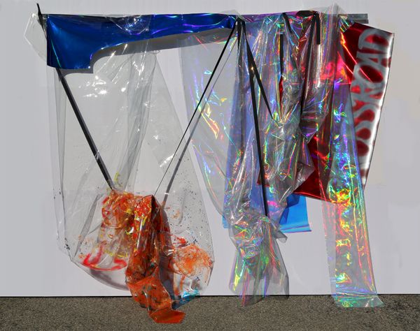 Kaloust Guedel made "The Fallen Sky" using plastic sheeting, color filters, and nylon straps. These are materials that you might find in a hardware store rather than an art supply shop. Guedel has draped and bound these materials in ways that are both delicate and forceful. The plastic captures and reflects light, creating an ethereal, almost celestial effect. The colors are vibrant, and the nylon straps add a sense of tension and constraint. The industrial materials contrast with the title of the piece, suggesting something broken or damaged. There is a deliberate engagement with the aesthetics of both craft and design, challenging the traditional hierarchy of art forms. By taking commonplace, mass-produced goods, Guedel asks us to consider the role of consumerism and waste in our lives, and how we can find beauty in the discarded. The work reminds us that art can be found in the most unexpected places, and that even the most mundane materials can be transformed into something beautiful and meaningful.