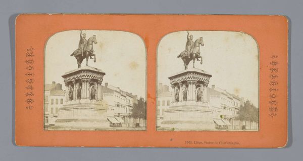 Editor: So, here we have a photograph by Sophus Williams, titled "Standbeeld van Amazoni\u00eb voor het Altes Museum in Berlijn," taken in 1876. It depicts a bronze sculpture of an Amazon warrior on horseback. The classical style of the figures gives it such a strong, monumental feel. What stands out to you when you look at this? Curator: The sculpture presents a fascinating tableau of dominance and struggle. Look at the Amazon herself; she is both physically imposing and poised, spear raised, a clear signifier of power. Consider, too, how the rearing horse is locked in combat with a feline – the turmoil embodied by the writhing, twisted figure represents conflict, yet the Amazon surmounts it. Editor: I see the physical struggle playing out in the sculpture now that you mention it! Is that tension deliberately positioned against the rigid columns of the museum’s architecture? Curator: Exactly! That juxtaposition amplifies the narrative. We have the untamed Amazon against the established order represented by the neoclassical building. It brings up complex questions about civilization versus the “barbarian,” or the exotic ‘other’. Who is really in control? And what values are truly being protected? Also note that bronze, the medium itself, evokes a historical weight, aligning the subject with classical ideals and heroic narratives. Editor: So, it's not just a beautiful sculpture but a statement about power, culture, and the narratives we tell ourselves. Thank you, I never would have considered that! Curator: Indeed! This photograph freezes a moment not just in time, but within the ongoing and evolving symbolic drama between past and present.