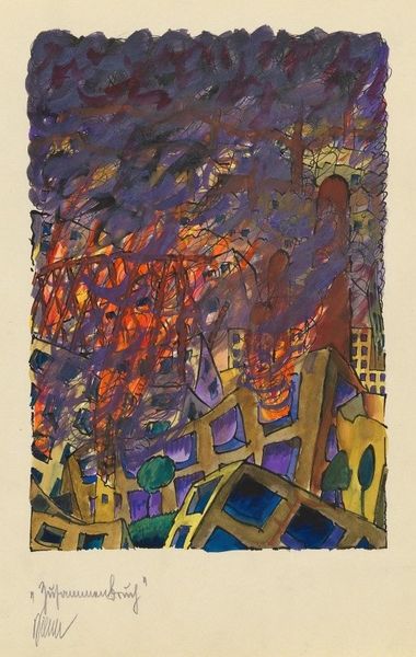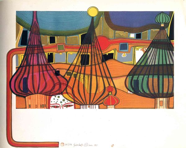 Curator: What strikes you about this vibrant mixed-media print, "540 House and Spiral in the Rain" by Friedensreich Hundertwasser? It's dated 1962. Editor: Utter chaos, delightful chaos. The composition feels almost schizophrenic, with those two distinct halves battling for attention. There’s a real tension in that contrasting geometry. Curator: Hundertwasser was fascinated with spirals. It was his philosophy about organic form. Look how he juxtaposes the grid-like structure of the house with the fluid, almost cellular spiral. He believed in avoiding straight lines, associating them with godless and soulless designs. Editor: Yes, the hard, angular edges against those swirling lines create an intentional disjuncture. But color also plays a pivotal role. The bright reds, yellows, and greens are applied in a seemingly arbitrary fashion, further disrupting any sense of visual harmony. Curator: The 'rain' element seems symbolic too. The repetitive dot-like pattern may stand in contrast with orderly representations. Think of what rain does—it erodes, dissolves boundaries, and creates movement. It mirrors Hundertwasser’s concept of nature reclaiming artificial constructs, as we can see within the overall them of this urban cityscape. Editor: It almost seems like two conflicting visual systems clashing, or even corroding. The spiral is caged inside a geometric structure on the right; is this supposed to represent the way humans dominate the world? The architecture on the left, while bizarre and childishly drawn, feels similarly trapped by horizontal and vertical lines, almost as if it's caged in as well. Curator: Interesting point! Hundertwasser often expressed concern over societal rigidity and the importance of individuals expressing themselves. So, both sides can symbolize different forms of confinement. I see, too, how the scale seems deliberately skewed. Buildings warp into near-cartoonish representations. Editor: Exactly! The distortions destabilize the very idea of “house” or “city”. A formal approach reveals just how deliberately constructed that sense of instability is. It feels…raw. Curator: He's inviting us to deconstruct what a cityscape signifies to us and contemplate what might blossom if boundaries were blurred, if structures were made more permeable. Editor: It’s visually jarring, unsettling even, but that disruption pushes us to look beyond conventional representation. Curator: The piece offers a symbolic message. Thank you for sharing your thoughts. Editor: A deconstruction of architectural landscapes, quite thought-provoking actually.
