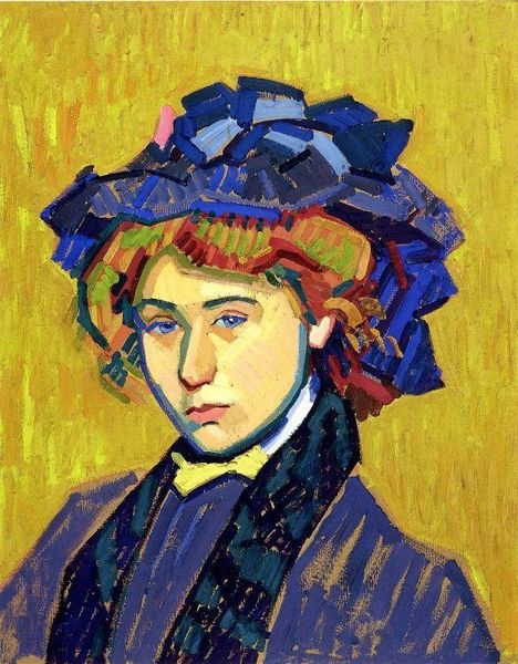 Editor: This is Max Pechstein's "Porträt Frau Cuhrt" from 1908, made with oil paint. I find the gaze of the subject so direct and almost unsettling, yet there's a naivete in the execution. What strikes you most when you look at it? Curator: The symbols surrounding her seem contradictory. The flowers adorning her hair – traditionally symbols of fertility and beauty – are rendered with almost violent strokes, clashing with what would otherwise be a conventional, if somewhat austere, portrait. Pechstein is evoking something deeper. Editor: Deeper, like what? Curator: The colors, for one, scream German Expressionism, don't they? The bold blues and reds fight for attention, creating a tension that reflects the anxieties of the time. Do you think the flowers and the gaze might be a mask for something? Perhaps the societal constraints placed on women? Editor: So you think he is making a statement? Maybe using those cultural symbols to show both her strength and her confinement? Curator: Precisely! It speaks volumes about cultural memory—how even in modern portraiture, symbolic weight from the past shapes our interpretation. Think about how this portrait contrasts with more flattering depictions. What statement is Pechstein making with her raw, unflinching look? Editor: That's really interesting. I was just seeing a face, but you’ve opened up this whole symbolic world within the painting. Curator: And hopefully it illustrates how every mark and colour choice carries its own encoded history! Seeing her anew? Editor: I definitely am! Thank you for sharing your insights. I'm leaving with a lot to think about!