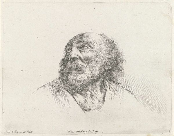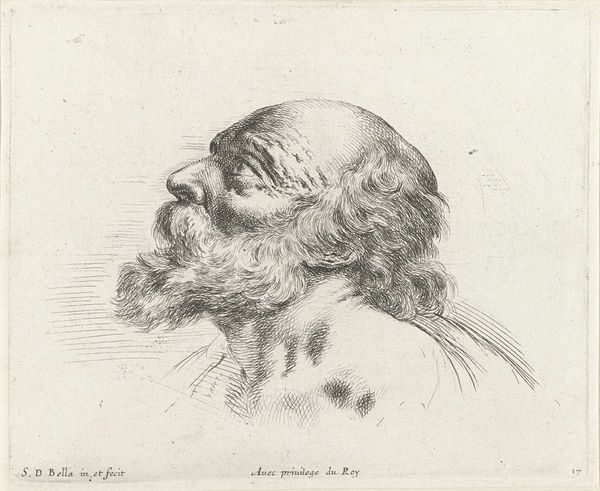 Editor: Here we have "Head of a Bald Old Man with Beard, Looking Down to the Left (Possibly St. Peter)" created between 1620 and 1664 by Stefano della Bella. It's an etching and you know, the level of detail is pretty astonishing, considering the medium. What's your take on it? Curator: Immediately, I see the socio-economic implications embedded within the etching process itself. The 'privilege du Roy' inscribed signifies royal patronage, crucial for artistic production in that era. It’s a nod to the power structures that enabled Della Bella’s labor. The fine lines and detailed shading tell a story of skill but also of time—time spent, material costs, and a market willing to support this type of specialized labor. How do you perceive the materiality of the work? Editor: Well, the etching itself, it's like he's almost sculpting with these tiny lines, there is such depth of feeling with so few marks. The paper too—I wonder what kind of paper was common then, and if that played a role in the process. Curator: Exactly! Think about paper production during the Baroque period, the labour involved in papermaking and ink production. Were these materials readily available? Was there a class element tied to these supplies? Consider how access to materials impacts artistic expression. Also, is it accidental or a design choice that Bella used linear marks and lines and what implications does this have? Editor: That's fascinating. So the materials themselves, and who has access to them, really shaped the artwork we see. It shifts how you see these kinds of Baroque artworks, realizing all this production happening to facilitate this end. Curator: Precisely. It makes you appreciate not only the artistry, but the historical means of that art’s production and who the work serves, who gains access, who profits and also, what new meanings that brings to how we view Bella's choices now. Editor: I will be paying much more attention to the means of production from now on. Thanks!