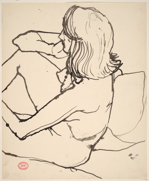 Curator: Here we have Richard Diebenkorn’s "Untitled [seated female nude slumping with head in hand]", created sometime between 1955 and 1967 using ink on paper. Editor: The figure's posture immediately strikes me. The slumped shoulders, the head buried in her hand...it conveys such a feeling of weariness, a heavy emotional weight. Curator: It's interesting how the simple medium of ink, applied with such deliberate, economical lines, achieves that effect. Look at how the negative space is as crucial as the drawn lines in defining form, in evoking volume and depth. Editor: Yes, Diebenkorn uses such starkness in mark-making; that aesthetic aligns well with the sense of alienation and introspection prevalent in much mid-century art. This drawing presents the figure vulnerably, almost as an embodiment of the anxieties permeating postwar American society. Curator: You see the anxieties reflected in the pose. I also see a very rigorous compositional strategy: how he uses linear networks to explore the interplay between representation and abstraction. Each stroke exists independently while simultaneously contributing to the totality. Editor: I agree with you in as much as Diebenkorn successfully renders a timeless statement on the female form and psyche via an economical application of lines. Given the rise of second-wave feminism and growing social awareness during the period that it was made, this expression might signal solidarity with woman's suffering. Curator: His work is intriguing, his practice of minimalism to achieve a sense of complete emotional openness, unvarnished reality in all its complexity and imperfection. Editor: Indeed. The artwork stands as a testament to the social consciousness present throughout Richard Diebenkorn’s artistic contributions, and leaves an impact that reverberates.