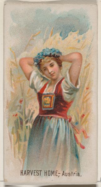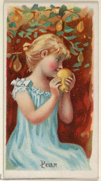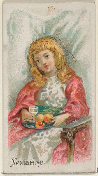 Editor: So, here we have "Malaga Grapes," a print from 1891 created by Allen & Ginter as part of their Fruits series for cigarette brands. It depicts a young girl holding a bunch of green grapes over her head. It's charming but something about the girl’s expression feels a little… unsettling to me. How do you interpret this work? Curator: It's unsettling precisely because it is embedded within the complex machinery of late 19th-century capitalism and social values. Consider its origin: a cigarette card. This was a marketing strategy explicitly aimed at attracting consumers, normalizing tobacco use. And the child…she's positioned as an alluring object herself, linking innocence with a product that we now recognize as harmful. The composition, the Japonisme influence, everything is carefully designed to entice. How do you think that marketing objective affects our reading of the child? Editor: I hadn’t thought about it that way. It does change things, knowing the image was meant to manipulate the viewer. There’s a dissonance now – between the surface-level sweetness and the underlying intent. Curator: Precisely! And consider how such imagery often perpetuated certain ideals of beauty, gender, and even race. Who gets represented in these idealized ways, and who is left out? The "innocence" projected onto this girl also serves a particular narrative. How do you see that connection playing out? Editor: I guess I see now it isn’t just a cute image. It’s a product of its time, reinforcing some problematic ideas about children and consumerism, beauty and value. It really changes the way I see it. Curator: Absolutely. It’s about peeling back the layers and asking whose stories are being told and for what purposes. Now, that is something to think about.