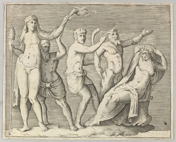 This engraving, titled "Man Playing Two Flutes and Woman on Lionskin," presents a classical scene rendered with intricate detail through the stark contrast of line work. The composition centers on two figures reclining on a lionskin, set against a backdrop of horizontal lines, creating a sense of depth and space. The linear precision and rhythmic arrangement of lines serve not only to define forms but also to create a sense of texture and movement. Note how the artist uses cross-hatching to model the figures and how the parallel lines vary in density to simulate the effect of light and shadow. This emphasis on structure and form invites a semiotic reading, where the lines themselves function as signs that articulate the underlying order of the scene. Here, the artist engages with humanist values through a close study of the human form. The visual elements of line and form, therefore, are not just aesthetic choices but tools for conveying intellectual ideas about the relationship between classical ideals, humanism, and representation.