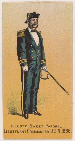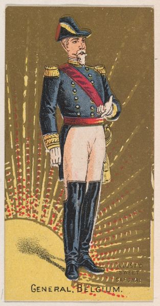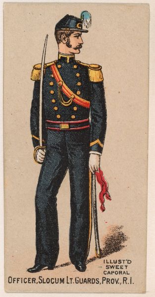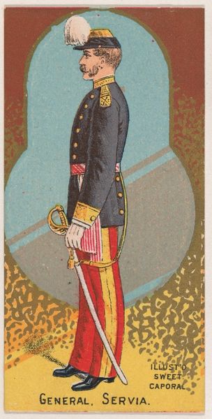 Editor: Here we have "Captain of Grenadiers, Holland" from 1888 by the Kinney Brothers Tobacco Company, a drawing printed to promote Sweet Caporal Cigarettes. It definitely strikes a slightly comical note, given the captain's exaggerated posture and features. What stands out to you from a formal perspective? Curator: The interplay of geometric shapes, primarily the rectangles of his uniform and the sword against the background, is quite striking. Note the chromatic relationships as well; the disciplined pattern of gold buttons draws our eye to the red sash, mirrored again at the cuffs, creating visual consonance. Editor: So the artist is intentionally using the colour red to make us look around the whole image? Curator: Precisely. Semiotically, consider how the rigidity of the lines and angles of the figure contrast with the swirling, almost dreamlike quality of the background. Are these two distinct images or purposefully interconnected, a signal of reality vs something more surreal? Editor: I see what you mean. It's almost like he's superimposed on a completely different scene. It's hard to see the logic of how they work together compositionally. Curator: Exactly. Also note the textures and implied materiality – the flatness of the printed image contrasting with the implied weight of the uniform and metallic sheen of the sword. Are these juxtapositions accidents of the medium, or elements with conscious intention? Editor: I guess thinking about it, the clash of materials creates an interesting tension. Thank you for pointing out some things I would have missed! Curator: My pleasure. Looking beyond simple representation leads us to contemplate art's deeper structure and its intended effect.