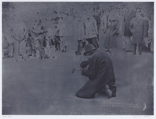 Curator: Joseph Woodson Whitesell's photographic print, "Untitled (spectators)," captures a crowd in observation. I’m struck by its candidness. Editor: It’s the dense, almost uniform composition that initially grabs me—the raw texture of the wooden bleachers contrasting with the varying fabrics. Curator: Right, and the image resonates with the early 20th century's focus on class and leisure. Consider how the attire speaks volumes about identity and social roles, particularly in relation to gendered expectations. Editor: Absolutely. And consider the labor involved in producing those garments! Each hat, each coat represents hours of work, from material sourcing to manufacturing and retail. Curator: It's a slice of life that invites us to consider those historical frameworks of social spectatorship. Editor: It does offer a fascinating window into the past, viewed through the lens of its material culture and production.