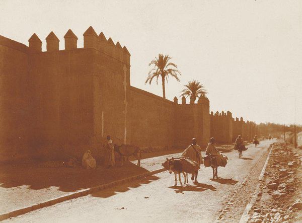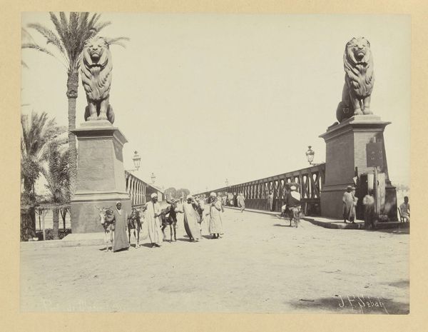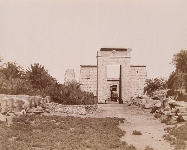 Curator: Welcome. We're standing before Antonio Beato’s photograph, "Tempel van Karnak," taken between 1862 and 1895. The photograph is held in the collection of the Rijksmuseum. Editor: It’s strikingly desolate, isn't it? The monochrome palette really emphasizes the monumentality of the temple against the sky and what appears to be an empty foreground. Curator: Absolutely. Beato’s use of monochrome draws attention to the architecture. The light, almost uniformly distributed, highlights the shapes and the textures of the stone. Observe how the composition is carefully arranged, with the temple positioned centrally. Editor: But what about those figures to the side? It’s hard to miss their quiet observation. How does their presence play with our understanding of colonization and representation within these visual landscapes? There's such a charged dynamic between observer and observed, don’t you think? Curator: Undeniably. The inclusion of those figures, as well as the line of trees to the left, introduces a play between scale and form, heightening our perception. There’s a beautiful dance between light and shadow. The frame becomes a carefully designed system, reflecting both depth and surface qualities. Editor: Though let's not romanticize that so-called "dance." We must acknowledge Beato’s role in perpetuating a certain gaze – a Western interpretation that reduces cultures and complex histories to aesthetic spectacle, especially within an Egyptian context. The people, the culture – are we actually engaging with it or simply consuming its image? Curator: It’s vital we examine these historical implications, and the visual composition in itself remains a complex interplay between form and historical record. How can we use our structural analysis of form and photographic development to expand discussions of colonial photography? Editor: Precisely. The enduring dialogue between art history and current theory is crucial to revealing multiple layers. As we grapple with legacies, this piece opens space for reflections. Curator: Indeed. Approaching artworks from different vantages not only enriches our perspectives, but expands the nature of analysis itself. Editor: Couldn't agree more.