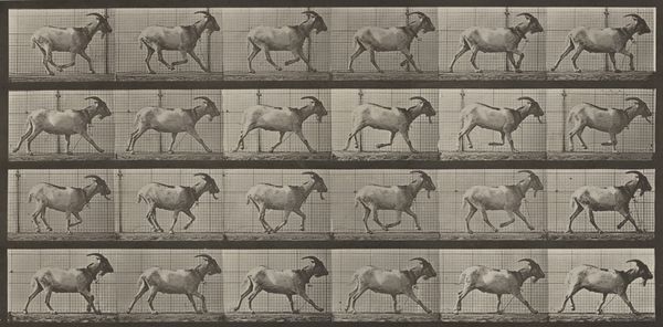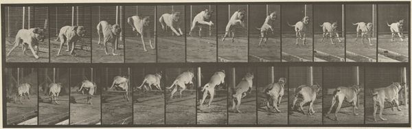 Editor: Here we have Eadweard Muybridge's "Plate Number 705. Dog; trotting; mastiff, Dread," a gelatin silver print from 1887, essentially a photographic study of a dog in motion. It strikes me how much it resembles early animation. What catches your eye? Curator: It’s compelling to consider this print, and others from *Animal Locomotion*, as fundamentally tied to the industrial revolution and its technologies. This isn't just about representing movement; it's about capturing and dissecting it through technological means. Muybridge used a series of cameras, triggered sequentially, right? Editor: That's my understanding, yes! A whole system of wires, triggers and electrically timed shutters. So, what's important about the *method* here? Curator: Well, it directly reflects an increasing societal desire to quantify and control the natural world, reducing motion to a series of discrete, measurable moments. This speaks to the labor invested – not just Muybridge’s but also the assistants and the animals. Also, the print itself. What does mass production, inherent in photographic printing, say about art? Editor: That's a great point. It shifts the focus from individual artistry to a repeatable, almost scientific process. But what does it *mean* to mass produce something considered fine art? Curator: It challenges the very notion of artistic uniqueness and the fetishization of the artist's hand. It suggests art can be democratized through production, though ironically, Muybridge's prints were sold, consumed by the wealthy. Ultimately, this work prompts us to think about art not just as image, but as a material consequence of its production process. Editor: It certainly makes me think differently about photography's role in art and science, especially given the historical context. Curator: Exactly, and questioning assumptions about artistic labor is very powerful in the light of capitalism, technology, and scientific means of production!
