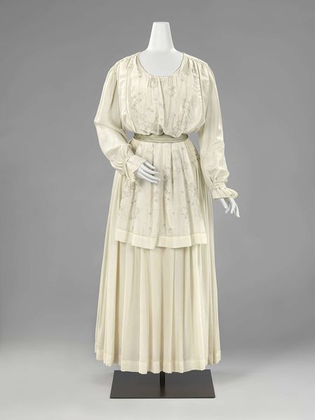 Curator: The opulence is almost overwhelming. The weight of all that velvet, both visually and physically, seems to suggest a bygone era of elaborate social rituals. Editor: Indeed. What we’re looking at is an afternoon dress, made sometime between 1901 and 1905, and part of the Metropolitan Museum of Art’s collection. I'm especially drawn to the way the light plays on the nap of the velvet, revealing the precise lines and the intense labor involved in creating such a tailored garment. Curator: The texture itself speaks volumes, doesn't it? Velvet was a textile strongly associated with wealth and power, which immediately projects onto the wearer a sense of prestige and high status within a community. It reminds me of portraits where individuals consciously signal their lineage. Editor: And yet, there’s a duality there. While the silhouette clearly speaks to high society, the olive green hue strikes me as subdued. It deviates quite substantially from the bolder colors often found in earlier garments from similar contexts. The pleating also hints at mass-produced textiles becoming more easily accessible. Curator: That is an interesting contrast. Perhaps the choice of olive green symbolizes a desire to project quiet elegance over conspicuous consumption? One can't ignore the intricate goldwork around the collar and sleeves; those decorative elements, almost like personal heraldry, still assert individual importance through symbolic embellishments. Editor: I agree, but let's consider the practical element: This dress was likely assembled using newly mechanized sewing techniques that reduced labor costs, albeit potentially exploiting sweatshop conditions. I wonder about the hands involved in this process. It definitely opens questions about the societal power dynamics between the wearer and maker. Curator: Yes, that's key! It becomes more than a piece of clothing; it's a relic, echoing societal expectations and desires. That olive green also recalls colors of nature and romantic notions around beauty. Editor: A blend of luxury and subtle revolt perhaps. Looking closer at the layers, one can find intricate examples of both artistic expression and the influence of broader social forces at play. Curator: Definitely an example where examining even a garment such as this can illuminate cultural nuances of a time. Editor: Precisely! Hopefully, visitors will explore not just what someone *wore,* but why, how, and with what implications for those involved in the making process.