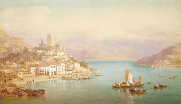 Curator: Let’s turn our attention to this evocative piece. It’s titled "Sunrise on the coast of Yalta," painted by Ivan Konstantinovich Aivazovsky. Editor: Immediately, I'm struck by the ethereal light. The sky, sea, and even the mountains seem to dissolve into this golden, hazy glow. It's less about sharp detail and more about capturing a mood. Curator: Aivazovsky, as a painter attached to the Naval Staff, had a specific project: to represent Russia's imperial might through the visual language of the sea. The Crimean coast, acquired by Russia, became a symbolic landscape. The sunrise signifies not just a daily occurrence but also a new dawn for the Russian Empire's presence in the Black Sea. Editor: I see that historical angle, but I'm also seeing how cleverly the composition uses the trees as vertical anchors. They frame the vista, leading the eye towards the radiant sun and then down to the serene bay with its subtle horizontal lines created by the water, ships, and coastline. The gradations of light here create a kind of harmony. Curator: Precisely. Yalta, as a developing resort town, also drew the elite of Russian society. Consider, then, how the artist may have aimed to portray not just natural beauty, but also an area open for settlement and cultural investment, with an exotic orientalist spin. Editor: The touches of orientalism intrigue me; one sees those reflected in the lone rider and his mount along the beach. I’m struck too by the brushwork, particularly in how it captures the almost liquid quality of the light reflecting on the water's surface, a technique that makes the scene feel so vibrant. Curator: That leads us back to the question of viewership. How did these paintings affect the mindset of those who were invited to invest in this "new" territory? To feel that sense of the sun always rising over Russian imperial prospects? Editor: It seems to invite introspection on beauty and light as much as empire, wouldn't you say? Looking at the arrangement, Aivazovsky certainly knew how to engage and focus the eye while setting an emotional tone that transcends politics. Curator: True, we are left contemplating how the formal and social are inextricably linked when it comes to artwork. Editor: It is an art that pulls you in with its light, even as we pull apart the contexts in which it appeared.