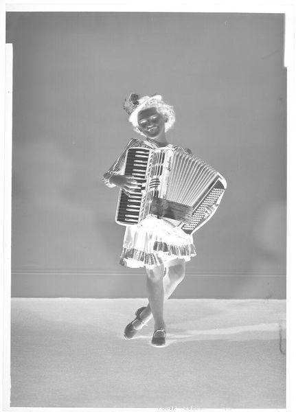 Editor: So this is John Deusing’s *Untitled (woman in sombrero and dancing dress, looking to the side)*, a 10x8 inch photo at the Harvard Art Museums. It’s a negative, which gives it this ghostly quality. What strikes you about the composition? Curator: The inversion of light and shadow complicates our understanding of form. Note the strong diagonal created by her gaze, drawing the eye across the frame. How does the texture of the sombrero interact with the smooth backdrop? Editor: It creates an interesting contrast, almost flattening the figure. Curator: Precisely. Deusing manipulates tonal values to disrupt conventional spatial relationships. The surface becomes paramount, challenging our perception of depth. Editor: I hadn’t considered that. Thanks for pointing out those formal elements.