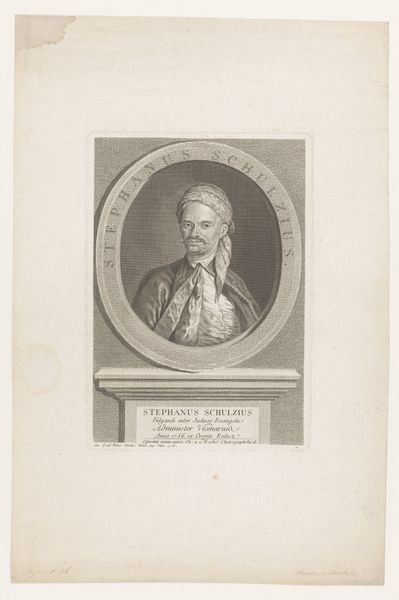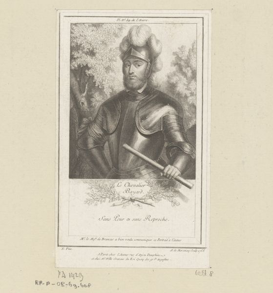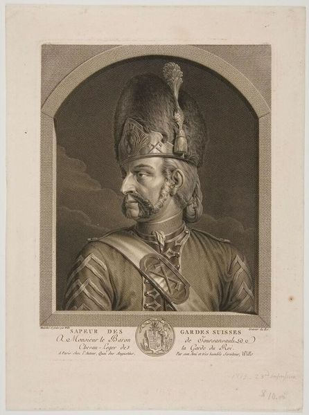 Curator: Here at the Rijksmuseum, we have Johann Georg Wille's engraving from 1779, "Soldier of the Swiss Guard." It's quite striking, wouldn’t you say? Editor: Immediately, the headdress grabs your attention. It's monumental, regal, almost obscuring the figure beneath. What is it suggesting about power and identity here? Curator: It is evocative, and as a work of art rooted in history and institutional structures, we can analyze this engraving through the lens of the Swiss Guard's evolving role. Consider their function, hired by European royal courts as mercenary forces, primarily for security purposes. It signifies their loyalty and the visual markers of power. Editor: Right, the regalia is certainly rich with symbolism. The fur headdress, that elaborately decorated sash, the confident gaze... These aren’t merely decorative elements. They are icons of protection and the wearer’s perceived invincibility. It’s a powerful, lasting image of authority and order, and yet, it hints at vulnerability with that sidelong glance. Curator: He is set against this arched, almost theatrical backdrop which heightens the portraiture, almost as if to place him upon a kind of historical stage, while his posture speaks more to an era of poised refinement than raw force. In art institutions like the Rijksmuseum, works like these aren’t only celebrated, but debated. Their meaning can change depending on a period's cultural values and assumptions. Editor: The precision of line is equally striking. Even in monochrome, the textures feel tangible—the softness of the fur against the crispness of his uniform. This precision draws me back to the symbolism itself. Every mark seems to hold weight, building up this image layer by layer, and echoing throughout its period and now. Curator: Absolutely. And that dialogue between material reality and constructed image is precisely what makes a work like this continually compelling within a collection. Editor: Agreed. It certainly gives me a fresh lens through which to see power represented.