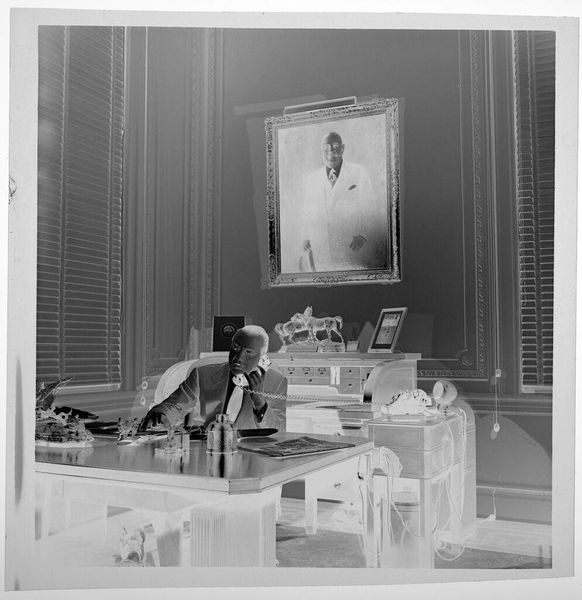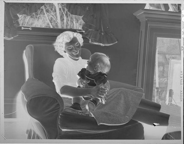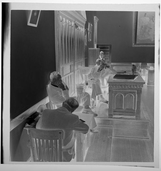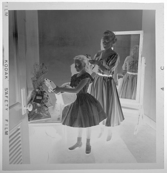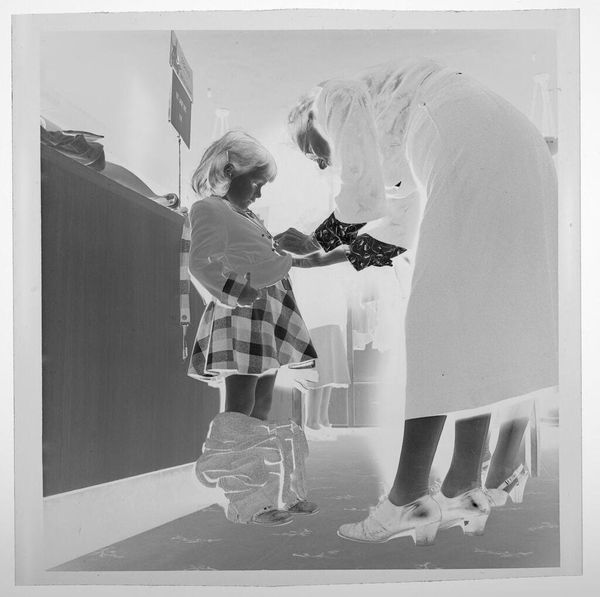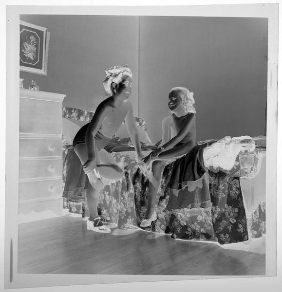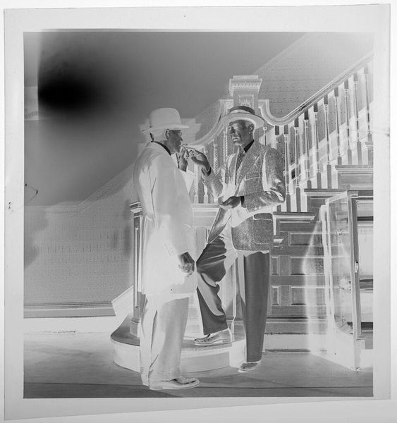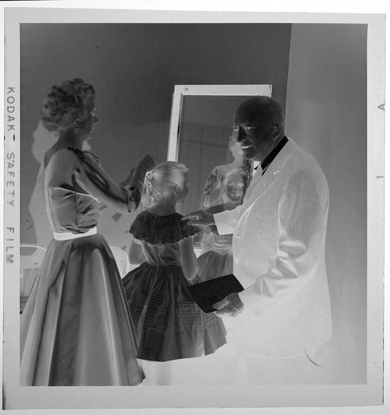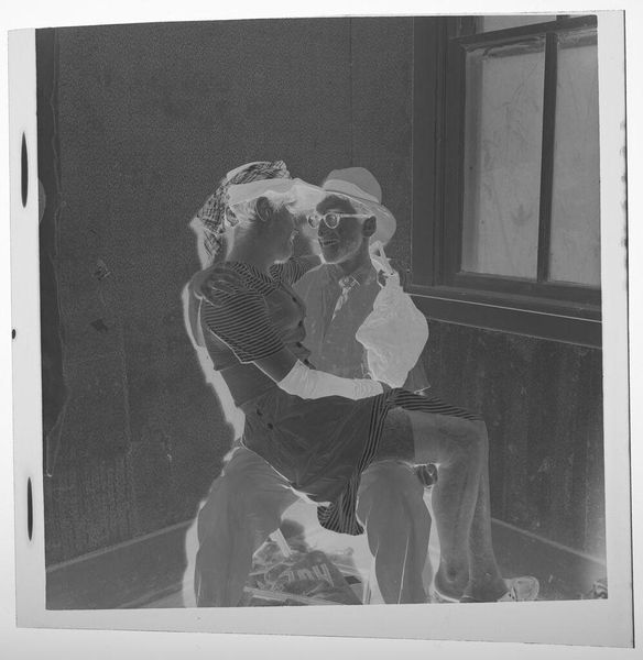 Editor: This is an untitled photograph by Jack Gould, showing a woman in a hat kissing a seated man on his head. The image is small, almost like a snapshot, and it has this wonderfully odd inverted tonality. How do you interpret this work? Curator: For me, it's about capturing a moment, a fleeting expression of affection, perhaps tinged with playful absurdity. Think of it as a visual poem—incomplete, suggestive, and deeply personal. It feels like a memory, a secret shared only between the subjects and the photographer. The figures in the background, are they witnesses or ghosts? Editor: I hadn't thought of them as ghosts before! Curator: Photography does that, doesn’t it? Freezes time, invites speculation. What do you take away from it? Editor: I think I see how such a simple moment can feel so layered. Thanks!
