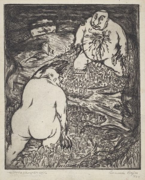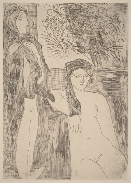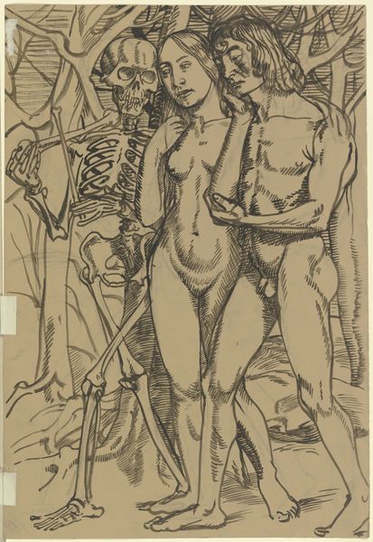 Curator: The raw, almost unsettling energy emanating from this piece immediately grabs you, doesn't it? Editor: Absolutely. Ernst Ludwig Kirchner's "Der Besuch der Freundin," created in 1912, feels incredibly charged. The visible mark-making and tonal variation is palpable; I want to explore its creation. It is rendered in ink, which, I believe, allowed for a level of immediacy and fluidity. The penstrokes feel frantic, urgent almost. What sort of cultural factors were driving its creation? Curator: German Expressionism as a movement prioritized the subjective experience above all else. "Die Brucke", the artists' group co-founded by Kirchner, aggressively overturned convention. Think about the rise of the industrial city and shifting social dynamics. Mass media shaped reality. There was great potential for income and leisure, but that was accompanied by equally significant feelings of isolation. Editor: The use of ink aligns perfectly with Expressionism’s emphasis on the artist's hand and emotional authenticity, while its creation reflects the influence of African and Oceanic art forms; in many cultures these artforms have direct relation to the natural elements of where those resources come from, while speaking truth and holding significance for entire communities. We have to address questions of appropriation of that historical connection. Is the ink bought commercially, sourced sustainably, or derived from unique places? Those aspects dictate the role and significance of that very materiality to our artist. Curator: That connection to global forces feels very palpable here! Kirchner was a voracious consumer of global cultures. In his lifetime, photography became easily accessible, shaping artistic styles through new compositional approaches to portraying the world in real-time. You notice that these forms embrace this fragmentation. Editor: I find myself lingering on the two women depicted. The juxtaposition between the fully clothed figure in what appears to be modern attire next to the unclothed figure is so dynamic. Curator: What a way to illustrate shifting expectations around modernity, and sexuality in public life. As art became something handled more casually by bourgeois society and art dealers, it became something to be consumed and sold by these communities, shaping its course. Editor: To summarize, looking at Kirchner’s method emphasizes process and commodification within modern culture. It offers a sharp commentary, especially when we analyze the history surrounding its exhibition and circulation. Curator: Absolutely, this is a key piece to unraveling this period.
