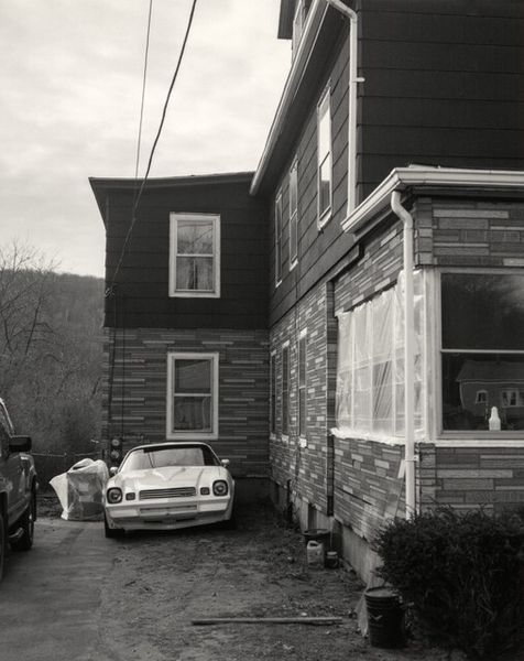 Curator: Here we have Roger Mertin’s "Breckenridge, Colorado," likely taken between 1977 and 1980. It’s a gelatin silver print. Editor: My first impression is one of starkness. It feels almost abandoned, despite being a street scene. The black and white tones really emphasize the angles and textures of the buildings. Curator: It’s a powerful observation. Mertin’s work often explored the intersection of the built environment and the natural world, questioning our relationship with space and place. Looking closer, the textures, the aging wood, the stark shadows evoke the passage of time. Breckenridge as a location would have likely been shifting at this time as tourism developed as its major industry. Editor: And look at how carefully he's framed the natural elements—the young birch trees. There’s an interplay between the rigid geometry of the buildings and the organic forms. You can almost feel the roughness of the weathered wood and the smoothness of the newly exposed pale birch. The way he renders light is also intriguing; you can almost touch it. Curator: It reminds me of Bernd and Hilla Becher's photographs of industrial structures – a focus on objective documentation but with a very distinct aesthetic sensibility that speaks to social structures. This documentary style serves the Becher's commitment to create social commentary through matter-of-fact portrayals. Editor: It definitely feels like an architectural study but is rendered through the handmade, the manual labour and skill embedded in his process. From camera adjustments to darkroom exposure, Mertin controls every stage in the printing process of the photograph. You know this work took some time and intention to craft. The texture of the image itself has so much to offer. Curator: And while rooted in photographic realism, there's an undeniable abstract quality too. The composition is almost disorienting; we are pushed to question the scene that is displayed. Editor: A lasting work. This makes me appreciate the beauty and subtle poetry inherent in the built and grown landscape all around. Curator: It reveals the often-unseen histories etched into the landscapes we inhabit. There is a larger picture that considers how cities change with cultural forces at play.