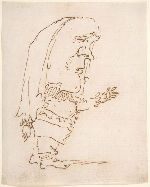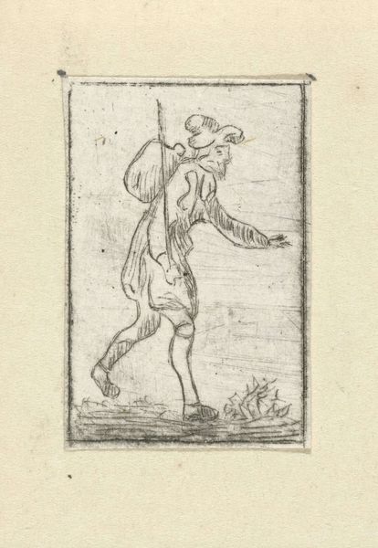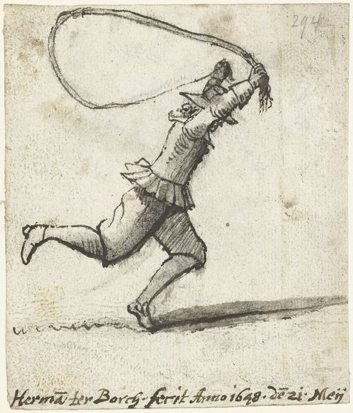 Curator: What a charming, slightly absurd figure. "Gooiende man," or "Throwing Man," as it's known, is a pen and ink drawing attributed to Gesina ter Borch, created around 1653. You can find it here at the Rijksmuseum. Editor: He looks like he's stepped right out of a dream! Or maybe a particularly whimsical play. The figure's contorted posture and exaggerated gestures feel very theatrical. Curator: Precisely! Ter Borch's sketchbook provided a private space to experiment, away from the formal portraiture of her male contemporaries. What symbols do you read into it? His upraised hand... what's he throwing, symbolically? Editor: Maybe not so much a specific object, but defiance, or a commentary on social constraints? It's gestural, you see? It's how he *feels* toward social forces. That large, almost drooping hat gives him a caricatured air, as does the strange detail of his trousers... quite unusual, but suggesting a type of rogue. Curator: Or perhaps rebellion! The act of 'throwing' itself. Breaking with conventions of Golden Age art... Gesina Ter Borch came from a family of artists, with her half-brother Gerard ter Borch the Elder acting as teacher... maybe this is adolescent rebellion against the establishment, given she was about 20 at the time. Editor: Yes, the familial influences must have been immense. It speaks to the cultural pressure young female artists must have experienced in that time period. And consider, the drawing exists outside of that world. This is freedom through form... the energy captured in the linework is almost more powerful than the figure itself. Curator: Do you think there is evidence of preparatory sketches beneath this ink work? Perhaps to re-work or establish a more complete sense of figuration. Editor: You can see some light pencil work but in no real sustained manner. It's immediacy suggests that Ter Borch may have focused more on gesture or even storytelling rather than striving for anatomical perfection. The sketch is more of an evocative, quirky little performance. Curator: Ultimately, it gives us a peek into a mind grappling with, or rather *throwing* itself against, societal norms and artistic traditions. It's a moment of uninhibited creativity captured in ink. Editor: It resonates still today because, for artists, and maybe for all of us, that struggle never really ends. It's freeing, like I mentioned, to see this very early instance of that impulse given such vivid form.