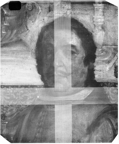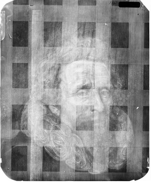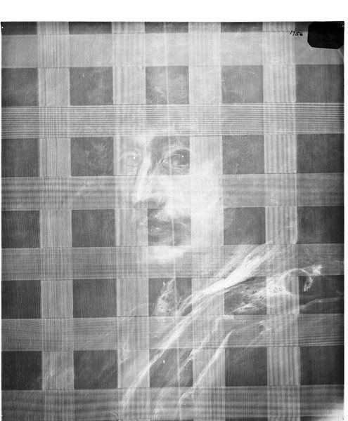 Curator: Here we have an X-radiograph of "Portrait of a Man (copy)," after Anthony van Dyck, part of the Harvard Art Museums collection. It shows us what lies beneath the surface. Editor: It's ghostly, almost like looking at a hidden truth. The composition feels disrupted by the grid of the X-ray. Curator: Indeed. It allows us to see the artist’s process, the underpainting, the pentimenti—revealing revisions. What we see, or don’t see, is almost as revealing as what is rendered. Editor: Absolutely. It's a reminder that images carry layers of historical and personal stories, revealing power dynamics embedded within the act of portrayal itself. Curator: What's striking is that this reveals the human impulse to create and recreate, to attempt to capture something, even in a copy. Editor: It's fascinating how this X-ray strips away the surface glamour, exposing the raw materiality of artistic creation. Curator: Seeing a portrait dissected like this makes you think about the original subject, perhaps also a man who had to perform a particular identity. Editor: True, and how images always exist in dialogue with their historical moment. Curator: It definitely makes you think about how images can be deconstructed, recontextualized. Editor: A powerful reminder that seeing is never a neutral act.