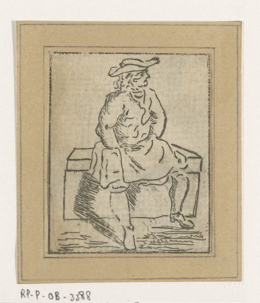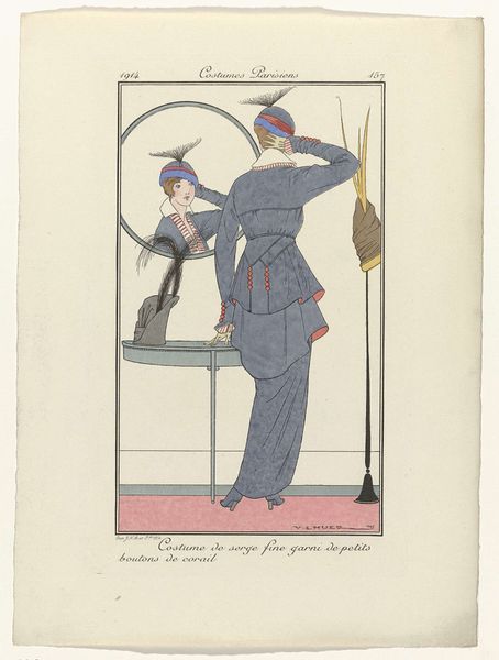 Editor: Here we have "Journal des Dames et des Modes, Costumes Parisiens, 1914, No. 157" by Victor Lhuer, created in 1914, using ink on paper. It’s so simple, just lines really, but I find it quite evocative. What catches your eye about this piece? Curator: Oh, it whisks me away, doesn't it? Straight to a Parisian salon just before everything changed with the Great War. It’s an echo of elegance just before the boom. I feel as if I can almost hear the rustle of silk. The artist is really skilled at conveying so much with so little. Notice the framing; how the curtain on the right mimics the woman’s pose, and almost entraps her gaze. Is she free, or a gilded bird? What do you think? Editor: I see what you mean! Trapped but beautiful. The reflection makes it more complex too. One of her is vibrant, but the other is constrained by the frame, gazing out. It also adds to the narrative... Like we’re peering into her private world. Curator: Precisely! It's voyeuristic and intimate, all at once. The details in the clothing, especially that feathery turban and the string of beads, scream opulence and sophistication. Lhuer captures a mood, a fleeting moment of pre-war glamour. But also notice the bare feet… almost subverting her wealth by making her ever so human. Editor: I hadn’t even noticed the feet! So much to unpack in something so simple! I came in thinking it was "just" fashion illustration, but now I see all these subtle layers of commentary. Curator: Exactly! Art often resides in these quiet corners. That fashion plate now pulses with a subtle, nuanced story. Maybe about the eve of great loss. Editor: Wow, thanks, I definitely have a fresh perspective now. It's no longer "just" a pretty drawing to me. Curator: The pleasure’s all mine. Now go forth and find your own fleeting beauty!