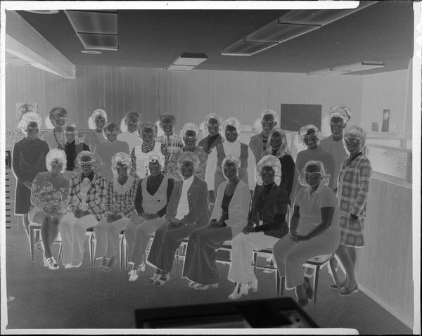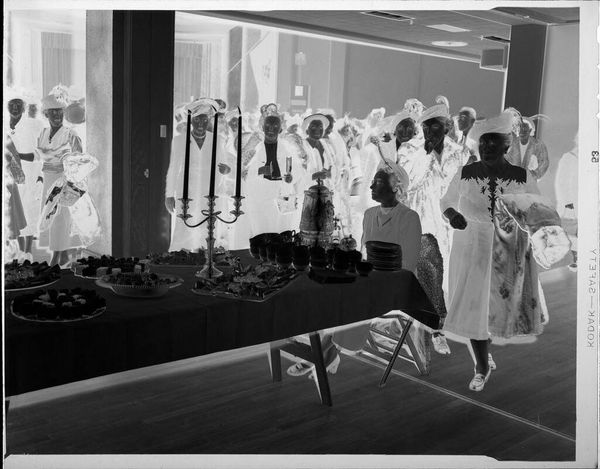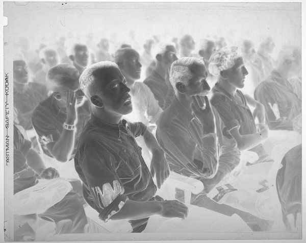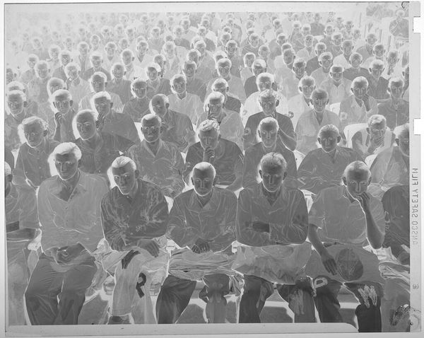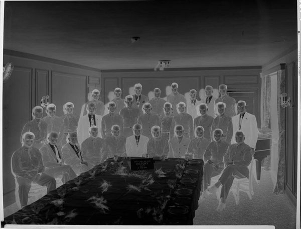 Curator: This photograph from Harris & Ewing, currently held at the Harvard Art Museums, captures a business conference. The date is unknown, and it's a gelatin silver print measuring about 8 by 10 inches. It’s a fascinating, if somewhat spectral, image. Editor: My immediate impression is one of conformity. The rows of men in suits create a visual rhythm, almost like a chorus line, but the inversion of tones gives it an eerie, almost unsettling feeling. Curator: The suits do create a powerful symbol of uniformity, a visual shorthand for power and status within a very specific social structure. The photograph speaks to the rituals of corporate life, echoing themes of ambition and hierarchy. Editor: And yet, the presence of women sprinkled through the room, though still a minority, hints at a shift, a breaking of that very uniformity. The photographer is capturing a moment of social change, however subtly. Curator: The lack of a definitive date adds to its universality; it could be almost any business conference from a certain era. It prompts us to consider how much – or how little – has changed. Editor: It leaves me pondering the weight of tradition and the ongoing struggle for equality in these very spaces, and how photography freezes these moments for us to analyze.