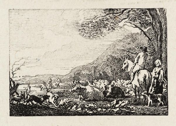 Curator: Before us is "Horses," an undated etching by Pieter van Laer, a Dutch Golden Age painter known for his influence on the Bamboccianti genre. Editor: There's a ruggedness to the scene, isn't there? A coarse visual texture created by the density of lines. Curator: Van Laer spent a significant time in Rome, where his work depicted the everyday lives of ordinary people, and earned him the nickname "Il Bamboccio," meaning "clumsy doll." Editor: The rendering of the figures, particularly the horse, feels deliberately unrefined. The animal has this awkward, almost comical stance. Curator: Exactly. And these depictions challenged the high-minded academic art of the time, offering a democratic view of labor and leisure. Editor: The formal looseness mirrors the subject matter—a rejection of idealized forms. Curator: It's a compelling image for thinking about how artistic taste is shaped by class and cultural values. Editor: Indeed, seeing how technique serves representation really deepens our understanding.