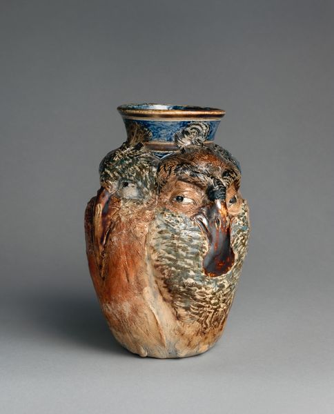 Curator: Looking at this artwork, titled "Jar in the Form of a Bird," made around 1888 by R. W. Martin and Brothers, what's your immediate impression? Editor: It has a sort of whimsical, unsettling quality. The ceramic is beautifully rendered, but the bird’s expression—almost comically grave—creates this strange tension. The posture appears formal, perched as it is on what looks to be a wooden plinth. What do we know about this jar’s place in society at the time? Curator: Martin Brothers emerged as a pottery studio during the British Arts and Crafts movement. Think of the context: Industrialization was rapidly changing England, leading to a rise of artistic collectives pushing back against mass production and embracing artisanal craftsmanship. Their creations, including pieces like this one now housed at the Metropolitan Museum of Art, were displayed at galleries, tapping into anxieties around industrial labor, aesthetics, and naturalism. Editor: Exactly. I wonder if the "grotesque" features of this jar serve as a critique of societal "types". Notice the exaggerated features— the droopy eyes, the rather large beak. Are we seeing a caricature, perhaps a satire on the elite of the Victorian era? This was also a period defined by natural sciences, taxonomy, and museums’ growth. Did those intellectual movements inform Martin Brothers' whimsical rendering of animals? Curator: Undoubtedly. There was a cultural fascination with the natural world, often filtered through the lens of scientific inquiry and exploration. They even referenced archaeological discoveries like the Dodo! This ceramic piece serves both a functional and symbolic role. They become curious vessels that tap into socio-cultural themes and invite discussion. Editor: So, it becomes more than just a decorative jar—it becomes a statement. It prompts questions about how we classify, control, and ultimately, perceive both nature and each other. It speaks to the Victorian era’s anxieties and their obsession with categorizing lifeforms. Curator: Precisely. And even now, gazing into its melancholic gaze, one is drawn into reflecting on art, society, and its enduring power. Editor: A poignant piece that makes one consider how much of human anxieties and cultural tensions travel through generations.