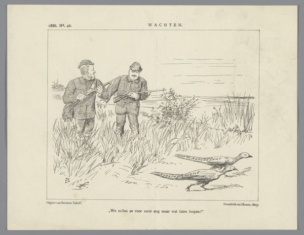 Editor: So, this is "Politieke spotprent over artikel 194," a political cartoon about Article 194 from 1886, made using pen and ink. It’s pretty evocative! There's definitely a dark mood, like these figures are drowning. How do you interpret this work? Curator: The image's potency resides in its clever deployment of symbols. The drowning figures, presumably politicians given the context, visually represent the failure or foundering of a specific political maneuver tied to “article 194." Drowning itself, of course, can represent being overwhelmed. What emotions do you think the artist wants to evoke through this symbolism? Editor: Definitely a sense of helplessness and maybe some political incompetence! The artist is definitely taking a jab at them! Curator: Exactly! The overturned wooden plank with "gewyzigd art 194" tells us precisely what the issue is. And the artist makes sure we understand this. Beyond simply conveying the event, the use of caricature serves a purpose. Why do you think the artist uses it? Editor: It intensifies the criticism and makes the politicians seem ridiculous and pathetic. It’s harder to take them seriously. Curator: Precisely! The cultural memory embedded here highlights a recurring theme – skepticism towards those in power. Through sharp, symbolic visual language, the cartoon distills a potent critique that still resonates. Are we truly learning from the past? Editor: That's fascinating to think about. The artist’s choices and the symbols they use definitely bring the message home and help it travel through time. Curator: Indeed! Symbols have a funny way of doing that; changing, yet staying eerily similar across decades, maybe even centuries!