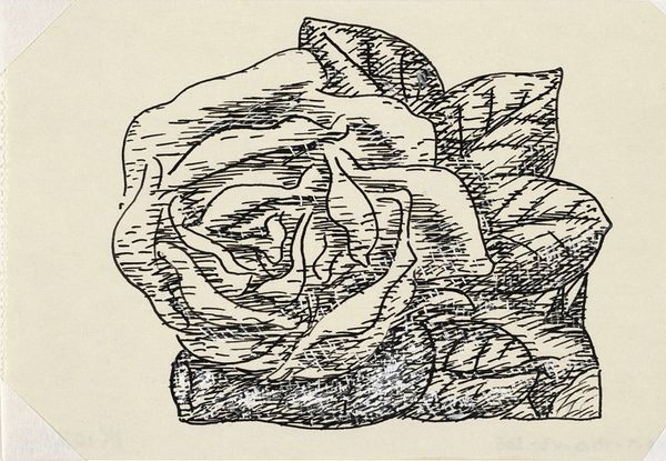 Editor: So, this drawing, “Zonder titel (roos)”, which translates to “Untitled (rose)”, was done by Leo Gestel between 1935 and 1936. It’s pen and ink on paper, and currently residing here at the Rijksmuseum. There's a compelling tension between the delicate subject matter and the stark, almost aggressive lines of the drawing. It almost feels like a rose trying to push through a barbed-wire fence! What do you see in this piece? Curator: That's a potent image, the rose and barbed wire! For me, it whispers of Modernism's embrace of both beauty and brutality, all swirling together in this little ink drawing. Look how Gestel doesn't try to pretty things up. The ink scratches and jabs. The lines aren't graceful, flowing curves. They're jagged and urgent. Editor: So, the roughness is intentional? I initially thought perhaps he was just quick to capture the moment! Curator: Perhaps both! I wonder if, given the dates, Gestel might be responding to the growing unease in Europe at the time? Do you see how the geometric, almost cubist-like, style lends a sense of fragmentation to the rose? Like something lovely being broken apart. Editor: That’s a really interesting point! I hadn’t considered the historical context so deeply. So it's not just a pretty flower but a reflection of a tumultuous era. Curator: Absolutely! And isn't that the power of art? To hold a mirror to both the artist's soul and the world around them. Gestel transforms something delicate, a rose, into something raw, energetic, almost a little frightening. Editor: Wow, I will never look at another flower drawing in the same way again! Thanks for sharing this with me. Curator: My pleasure! Sometimes the most beauty lies within the thorns, wouldn't you agree?