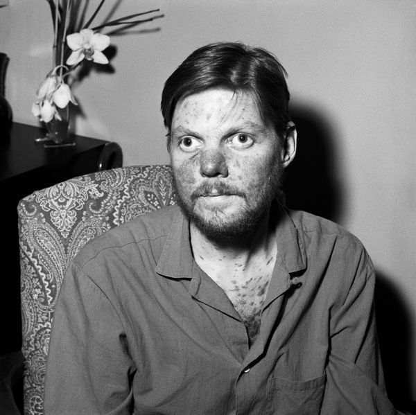 Curator: What strikes me immediately is the quiet intensity of this portrait. The subject's gaze is so direct. Editor: I see it too. Rosalind Solomon crafted "New York" in 1987. The gelatin-silver print masterfully uses light and shadow, the contrast really pushes forward a figure against an almost indiscernible urban background. Curator: It’s precisely this contrast, or opposition, that commands attention. We are immediately face-to-face with an urban everyman. The white tank top as the sartorial synecdoche of the common American. Editor: Yes! The high contrast emphasizes texture—from the subject's skin and hair, to the subtle weave of his tank top—bringing forth this raw and genuine depiction. The pose itself seems so artless. Curator: Yet that artlessness is deliberate, or, at the very least, expertly composed. Consider the visual codes it summons: The unadorned man stands in as every man in this contemporary urban parable. This man embodies both the struggle and potential found within a modern American landscape. Editor: And that setting itself! A concrete landscape just hinted at; yet those structural, repeating squares signal "urban" efficiently without taking away from the subject himself. Curator: The lack of distinct background sharpens the symbolic value of this individual—the photograph transcends singular portraiture, evolving instead into the visual emblem of the late-20th-century urbanite. A stoic observer in his environment. Editor: There’s a simplicity, yes, a reductive power, to black and white that I think accentuates this reading. It encourages you to look for signifiers outside of color... Curator: It does. This is why this image, through stark lines and textures, encapsulates a shared urban existence, the individual both separate and yet part of something collective. Editor: A study of contrasts, really; each element purposefully designed to guide the viewer to new, layered readings... It makes the photograph perennially engaging. Curator: Indeed, the subject serves as both a signpost and a mirror. One must reckon not just with *him*, but with what *he* represents—then, crucially, with the relationship between them both.