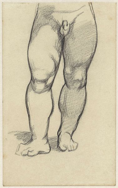Curator: This delicate pencil drawing, "Male Left Leg, for 'The Tree of Forgiveness'" by Edward Burne-Jones, gives me a jolt. It's a disembodied leg, quite literally hanging there. What does it evoke for you? Editor: It feels almost… sculptural? Like a fragment from antiquity, unearthed, weathered, yet retaining a certain grace in its form. It’s a study, so it lacks the polish of a finished work, but that raw quality lends it an immediacy, don't you think? Curator: Absolutely. And knowing Burne-Jones, steeped in classical mythology, it makes you wonder what character this leg might belong to, which story, what's the symbolism of singling out a limb like this? It makes me ponder the Pre-Raphaelite interest in symbolism. Editor: Right, and the "Tree of Forgiveness" context adds a layer. Perhaps a reference to a journey, a penance, or a sacrifice requiring physical endurance? It's interesting how a single, incomplete form can contain so many potential narratives. Curator: It does highlight, if you think about it, how art is a language, with its own grammar, its own potential for subtle or overt storytelling, doesn’t it? Editor: It certainly does. I'm left feeling like I've just glimpsed a secret, a fragment of a forgotten myth.