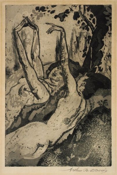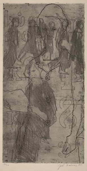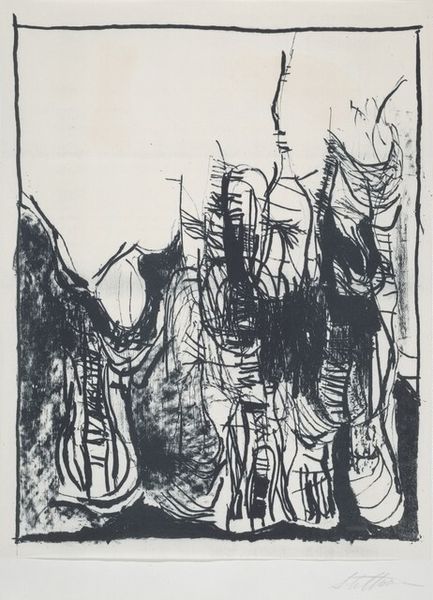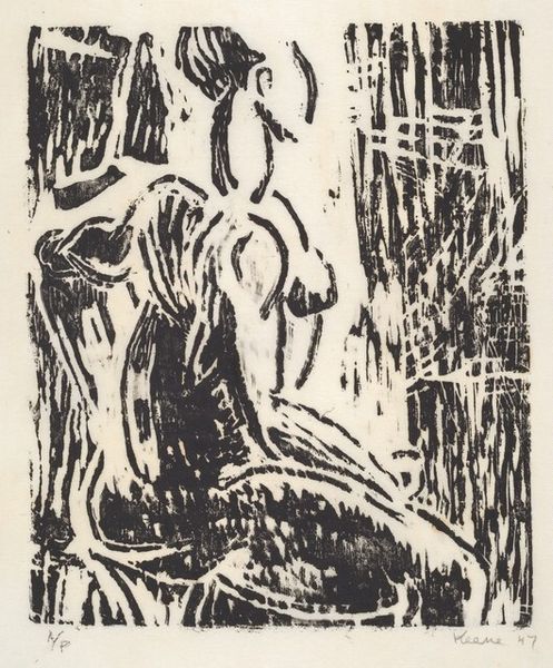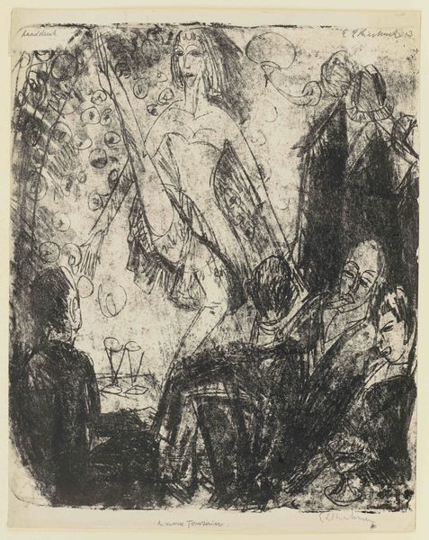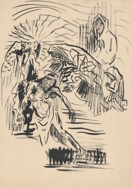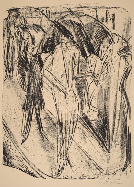 Ernst Ludwig Kirchner made "Dame Im Regen" without specifying the date, using what looks like lithographic crayon on paper. The way he's handled the crayon feels both immediate and raw; there’s a real sense of the hand at work, wrestling with the image. It's like he's not just drawing but also excavating the forms from the paper. I'm drawn to the way the texture of the crayon creates this gritty surface, particularly in the dark areas around the umbrellas. There's a tension between the graphic quality of the strokes and the way they smudge and blur, suggesting the diffuse light of a rainy day. Check out how he uses these lines to convey the feeling of movement, like the rain is actually falling. Kirchner's work reminds me of Edvard Munch, both in their emotional intensity and their expressionistic use of line. Both artists leave us with questions rather than answers, embracing the messy, unresolved nature of experience.