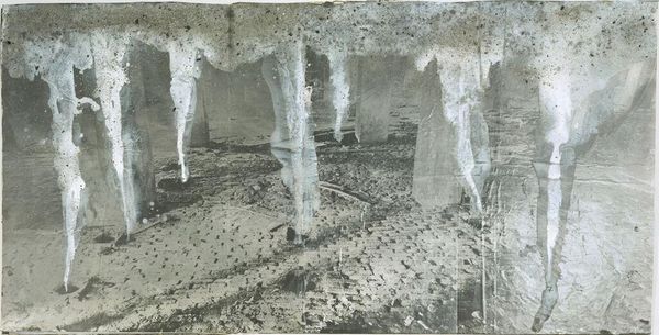 Editor: This is "Page opening 10 from 'The Heavenly Palaces: Merkabah'" by Anselm Kiefer. The dimensions are quite large at approximately 40 by 80 inches. The grayscale gives a somber and spectral feeling. What do you make of this? Curator: The ethereal quality you note is key. Kiefer often grapples with Germany's complex history, particularly the Holocaust and its aftermath. Consider the "Merkabah" title, referencing Jewish mysticism. Do you see the tension between the promise of spiritual ascent and the weight of historical trauma here? Editor: I think I do. The brickwork seems to suggest both construction and ruin. Curator: Exactly. This echoes the debates surrounding German identity and memory. It's not just about individual guilt but collective responsibility and the ongoing struggle to reconcile with the past. Editor: Thank you. I now realize there's much more than meets the eye in this piece. Curator: Indeed. By situating the work within its historical and cultural context, we can begin to understand the complex layers of meaning Kiefer intended.