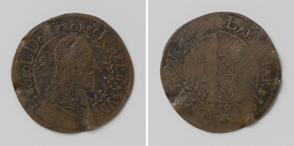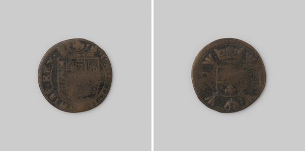 Curator: Immediately, the texture—that slightly corroded, time-worn surface—grabs me. It whispers stories of pockets, exchanges, and history. Editor: We’re looking at a “Hollandse dubbele stuiver,” minted in 1788. This piece of Dutch currency, part of the Rijksmuseum collection, features engraving and relief work on metal. Curator: And look at how that lion leaps from the shield. What does it say about Holland's identity, portraying its strength and asserting its power through visual representation? Even in miniature, symbols speak volumes! Editor: The symmetry is notable. The shield and crowned crest balance the composition on one face, contrasted by the straightforward lettering “Hollandia” on the other, almost a textual declaration. Curator: It's more than just text; it’s branding! "Hollandia" isn't merely a location. It’s an assertion of collective identity—the weight of generations who bartered with it, fought for it, and built upon it. Editor: Though small, consider the skill required to render such detail. The crown atop the shield isn’t simply ornamentation; it signifies governance, meticulously carved within that tiny space. It points to a high level of craftsmanship. Curator: The coin speaks volumes about 18th-century Dutch society. It's an artifact of daily life and echoes power structures. Each pass through the hands becomes a transaction across the threshold of social experience. Editor: Considering its relatively simple design elements, it is interesting to look at the overall presentation, one can almost reduce it down to its pure geometric shapes—circle, square, line— and the patterns they create in unison. Curator: Its very survival into our time adds an intangible value; holding history physically is what is captivating! This ordinary coin encapsulates a wealth of collective experience. Editor: Precisely, the intersection of art and object is captivating. Every visual element gives a sense of order, of meticulousness, and clarity—it is satisfying on a purely formal level.