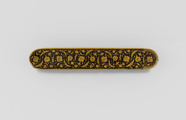 Curator: Before us is a pen box, part of the Harvard Art Museums collection, decorated by `Abd al-Husayn Sani` al-Humayun with scenes from Firdawsi's Shahnama. Editor: It's like a tiny, gilded world, isn't it? Packed with figures, all swirling in shades of ochre and sienna. Curator: Note the intricate composition, the way the artist uses dense figuration to articulate narratives. We see a conscious arrangement of forms... Editor: It feels so alive, though. Like a buzzing epic condensed into something you could slip into your pocket. Do you think it contained secret stories? Curator: Perhaps it was a status symbol, a declaration of its owner's refined taste and literacy. The rulers served a practical function, of course, but also... Editor: ...but also a reminder that even the most mundane objects can be vessels of extraordinary tales. I find it incredibly charming. Curator: Indeed. A compelling intersection of the functional and the symbolic. Editor: Yes, a golden echo of ancient glory.
