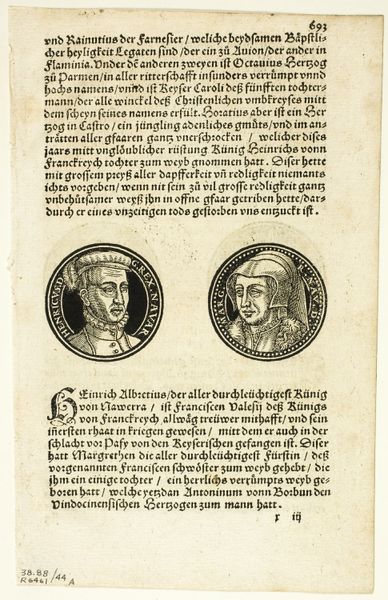 This is an engraving of Kings Solomon and Rehoboam, made by an anonymous artist. The composition is structured around two oval portraits, each king framed within a decorative border. Solomon, on the left, and Rehoboam on the right, each portrait sits above blocks of text. The artist uses contrasting visual elements to distinguish the two kings. Solomon is depicted with softer lines, and his garment decorated in a repeating design. Rehoboam, however, is portrayed with harsher lines, wearing armor. These visual choices emphasize their different characters as described in the adjacent texts. Solomon represents wisdom and peace, while Rehoboam embodies strife and folly. This engraving is not just a historical depiction but functions as a semiotic device, using visual cues and the structural juxtaposition of the two figures to convey a moral lesson about the consequences of wisdom versus folly. The artwork’s structure thus reinforces a didactic purpose, inviting viewers to interpret the kings' contrasting attributes within a larger framework of religious and ethical values.