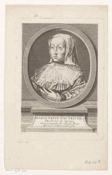 Antoine Masson created this engraving, "Portret van Marie Helyot", using the intaglio technique. The composition immediately strikes us with its formal arrangement. An oval frame, reminiscent of a mirror, encloses the figure of Marie Helyot, creating a sense of intimacy and containment. The meticulous lines, characteristic of engraving, define her features, clothing, and the subtle textures of the fabric. The contrast between light and shadow gives volume to her face. Consider the semiotic implications of this artistic choice. The lines, almost mathematical in their precision, evoke a sense of order and rationality. The engraving’s monochrome palette adds a layer of abstraction, reducing the figure to essential forms and lines. This aesthetic can be seen as reflecting a broader intellectual interest in systems and structures prevalent during the enlightenment. The formal qualities of the engraving, with its structured lines and enclosed composition, invite us to consider the interplay between representation, order, and meaning. The artwork provides insight into the cultural values of the 17th century.