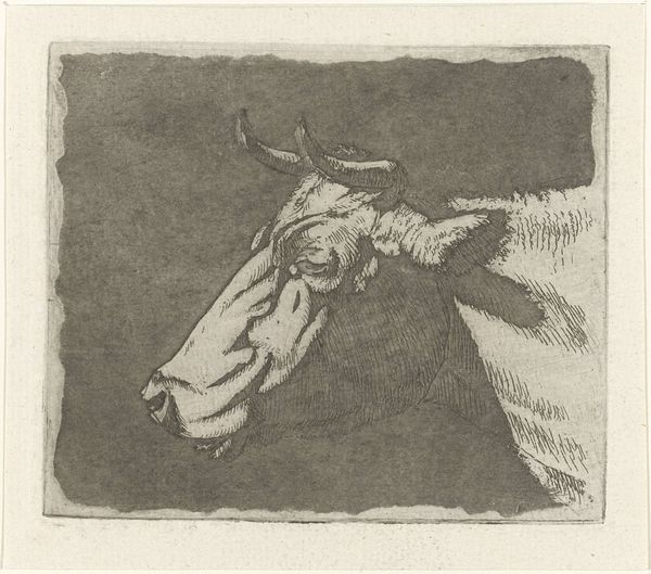 Curator: This is Barry Flanagan's "Welsh Cob," part of the Tate collection. It's a monochromatic print focusing on the elegant lines of the horse's profile. Editor: I'm immediately drawn to the simplicity. The stark contrast and minimal lines give it an almost ancient, classical feel. Curator: The horse, of course, is deeply symbolic. Across cultures, it represents power, freedom, nobility… and in Celtic mythology, it's strongly tied to fertility and the Otherworld. Editor: Interesting how the negative space shapes the animal's musculature and conveys movement, even in stillness. It’s a clever use of reduction. Curator: It strips away extraneous detail, leaving us with the essence of the horse, distilled through cultural memory and primal associations. Editor: Ultimately, it’s the formal interplay between the white line and dark background that makes it so compelling. Curator: Absolutely. Flanagan has left us with an image resonant with layered meanings, evoked by the simplest of means. Editor: It's a study in contrasts, both visually and conceptually, and has far more to say than one might assume at first glance.